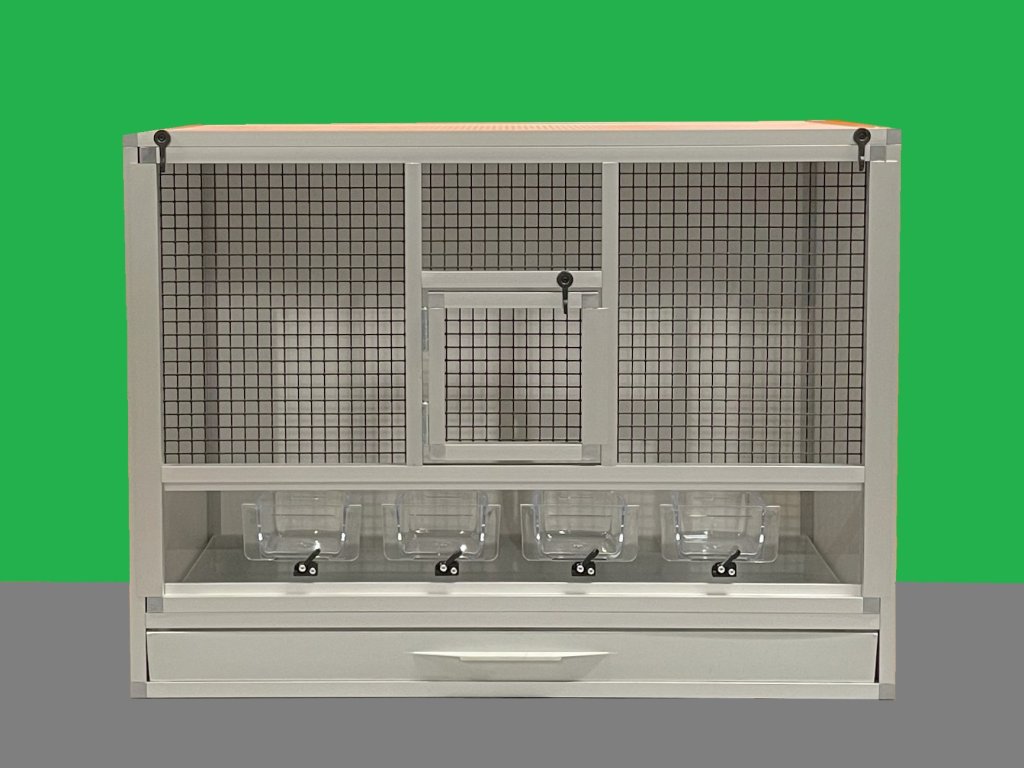 Bednová klec o rozměrech: šířka 72,5 cm, hloubka 41 cm a výška 54 cm má hliníkovou konstrukci tvořenou z profilu 15x15 mm. Hliníková konstrukce s povrchovou úpravu stříbrný elox. Desetimilimetrová výplň může být v barvě bílé, šedé a černé. Pokud zákazník požaduje strop potáhnout pletivem, je to možné. Přední stěnu lze celou vyjmout. Je to z důvodu snadného čištění - desinfikování klece. Přední krmítka lze jako náhradní dokoupit v našem e-shopu s označením M007.