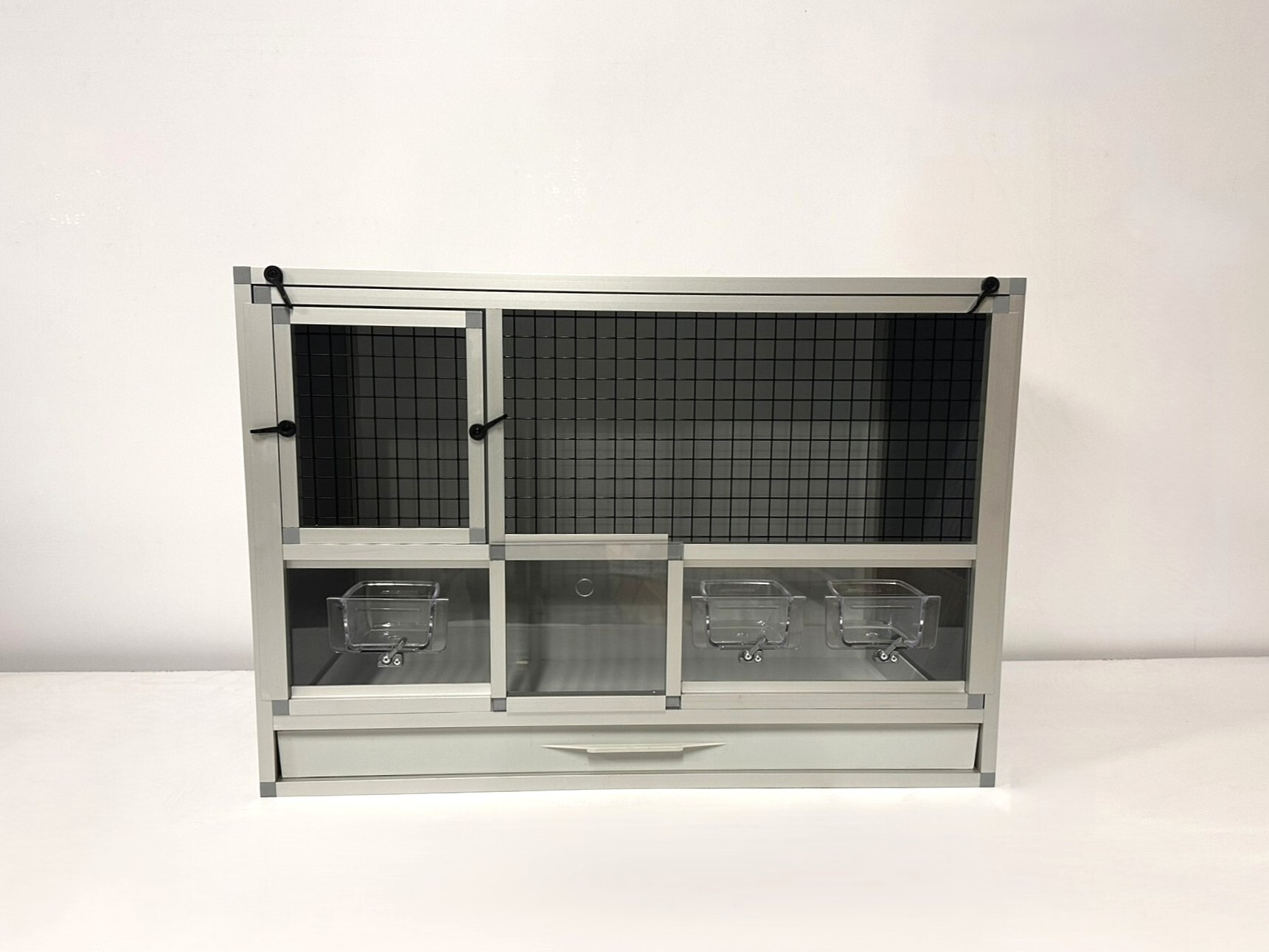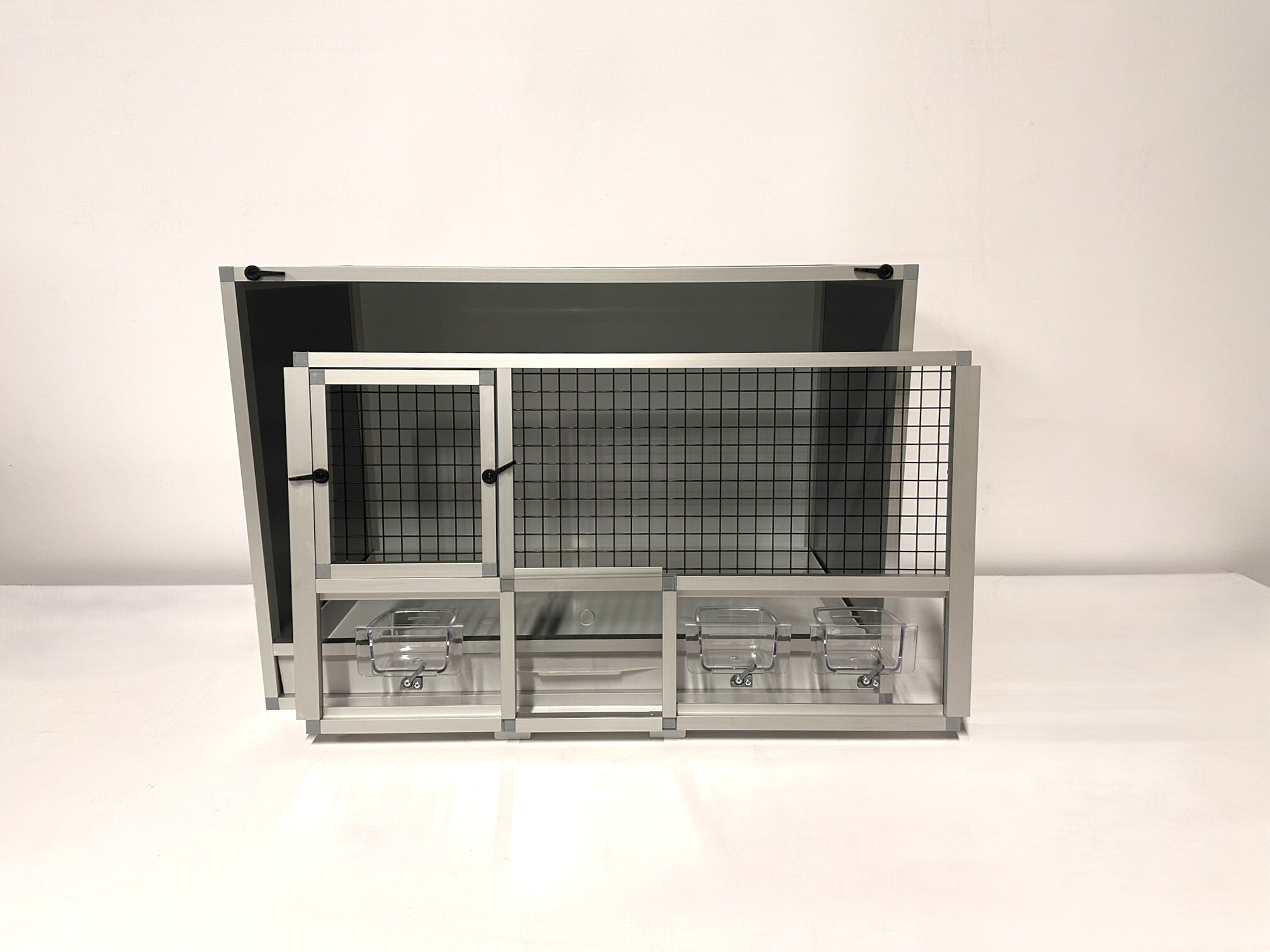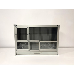 Přední stěnu lze vyjmout. Je to především z důvodu kvalitní údržby celé klece. Stěny této bednové klece jsou z velmi kvalitního materiálu hliníkový sendvič. Do toho materiálu lze řezat, vrtat.