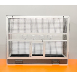 Bednová klec o rozměru šířka 99 cm, hloubka 50 cm a výška 78,5 cm má hliníkovou konstrukci tvořenou z profilu 15x15 mm s povrchovou úpravou stříbrný elox. Výplně klece jsou z hliníkového sendviče (hliník-plast-hliník). Jedná se o velice pevný a kvalitní materiál. Může být v barvě bílé, šedé, tmavě zelené a antracitové. Na přání i v barvě černé. Strop je potažen pletivem, na přání lze udělat strop plný. Přední stěna je tvořena vyjímatelnou mřížkou se čtyřmi krmítky. Součástí klece není napáječka. Doplňky lze přiobjednat https://www.aluhobby.cz/ptactvo/doplnky-pro-bednove-klece/. Velkou předností této bednové klece je především nízká váha (14kg) a vysoká pevnost. Díky nízké váze a použitým materiálům se velmi snadno udržuje v chovu hygiena.