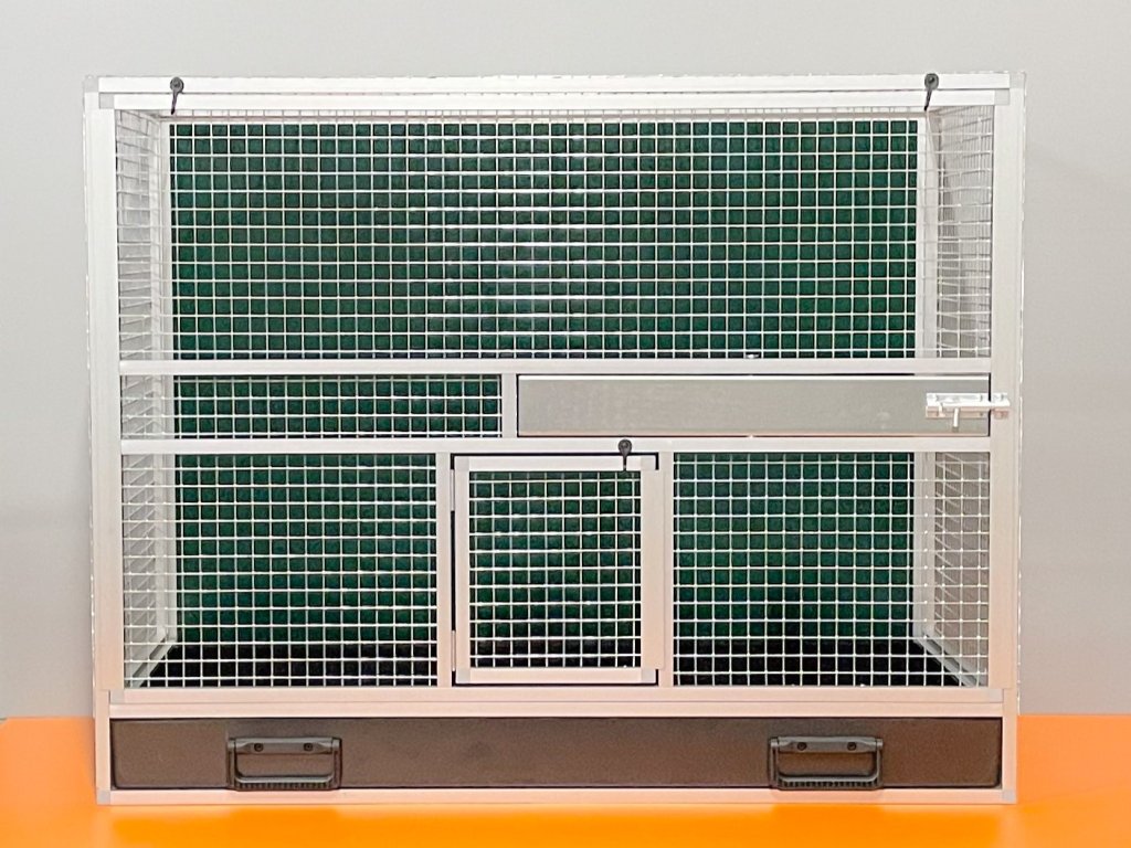 Strop je potažen pletivem, na přání lze udělat strop plný. V přední stěně je umístěný otočný krmný pult u nás označený jako KMP03. Jedná se o krmný pult se třemi miskami o obsahu 0,35 l. Součástí klece není napáječka. Velkou předností této bednové klece je především nízká váha 14 kg a vysoká pevnost. Díky nízké váze a použitým materiálům se velmi snadno udržuje v chovu hygiena.
