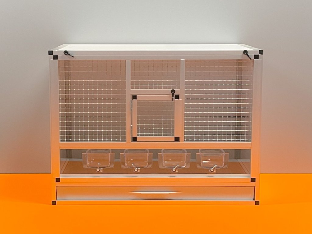 Přední stěnu lze vyjmout. Je to především z důvodu kvalitní údržby celé klece. Stěny této bednové klece jsou z velmi kvalitního materiálů hliníkový sendvič. Do toho materiálu lze řezat, vrtat. Přední stěny nabízíme pouze s italskými pletivy, a to v černé matné barvě, oko 19x19, drát 1,5 mm a stříbrné, oko 16x16x1,2 mm. Na přání zákazníka můžeme vyrobit bednovou klec, kde bude strop rovněž potažen pletivem.