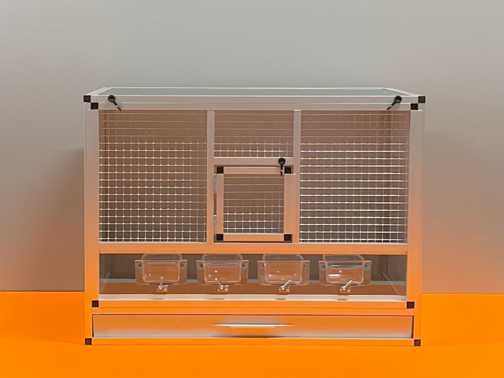 Přední stěnu lze vyjmout. Je to především z důvodu kvalitní údržby celé klece. Stěny této bednové klece jsou z velmi kvalitního materiálů hliníkový sendvič. Do toho materiálu lze řezat, vrtat. Přední stěny nabízíme pouze s italskými pletivy, a to v černé matné barvě, oko 19x19 mm, drát 1,5mm a stříbrné, oko 16x16x1,2 mm. Na přání zákazníka můžeme vyrobit bednovou klec, kde bude strop rovněž potažen pletivem.