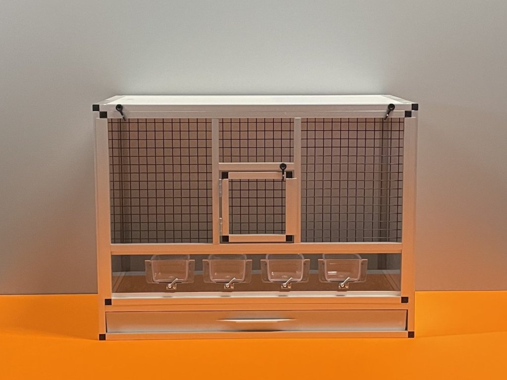 Přední stěnu lze vyjmout. Je to především z důvodu kvalitní údržby celé klece. Stěny této bednové klece jsou z velmi kvalitního materiálu hliníkový sendvič. Do toho materiálu lze řezat, vrtat. Přední stěny nabízíme pouze s italskými pletivy, a to v černé matné barvě, oko 19x19 mm, drát 1,5 mm a stříbrné, oko 16x16x1,2 mm. Na přání zákazníka můžeme vyrobit bednovou klec, kde bude strop rovněž potažen pletivem.