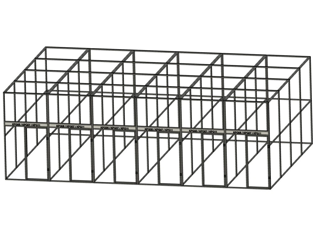 Rozměry voliéry šířka 600 cm, hloubka 402 cm, výška 200 cm. Jedná se o voliéru o šesti chovných boxech. Každý box je vybaven zásuvným nerezovým krmným pultem s gastro nádobami. Tento krmný pult si může zákazník zvolit dle svého uvážení. K výběru jsou připraveny pulty s označením KPG 05, KPG 07, KPG 11, KPG 12. Voliéra v nabídce je potažena značkovým pletivem Esafort oko 19x19mm drát 1,45mm. Pletivo je vždy k rámům uchyceno značkovými nýty Bralo. Na žádost zákazníka můžeme pletivo zaměnit za jiné z naší nabídky. Rovněž použití profilů z povrchovou úpravou eloxováním je na vyžádání a je s příplatkem 10% z celkové ceny sestavy. Pokud bude sestava umístěna a uchycena na zeď budovy, není potřeba zadních panelů. Tyto panely budou z celkové ceny odečteny. V ceně není započtená doprava a případná montáž na místě.