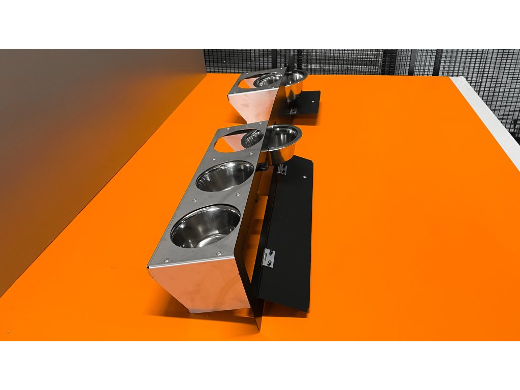 Krmný pult obsahuje tři misky o obsahu 350 ml a jednu misku o obsahu 700 ml .