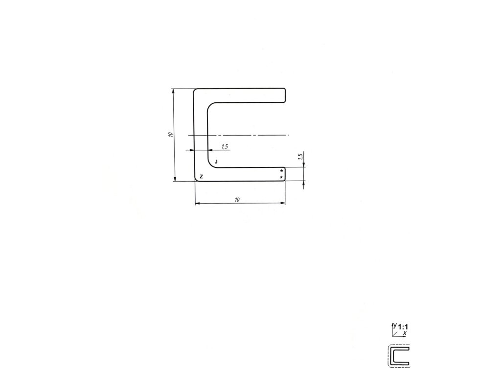 Rozměr profilu je 10 x 10 x 1,5 mm, vhodné na materiál o síle 7 mm.