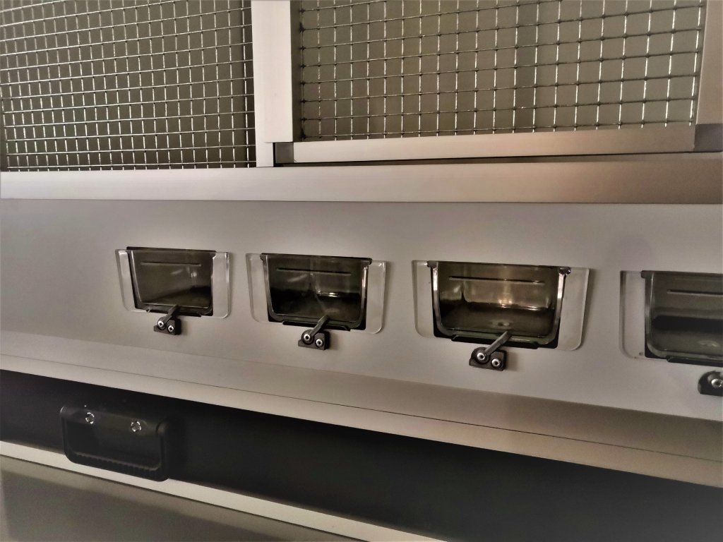 Základ krmné desky tvoří hliníkový sendvič o síle 3 mm. Tento sendvič je možné krátit na potřebnou délku. Minimální délka je 52 cm. Otvory jsou vyfrézovány. Zabezpečení krmítek je možné pomocí obrtlíku s podložkou. Náhradní misky do těchto otvorů naleznete v našem eshopu v doplňcích pro bednové klece s označením „krmítko šuplík M007“.