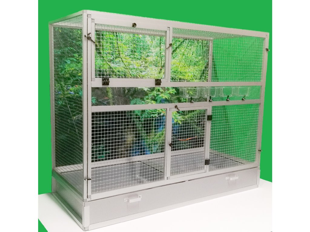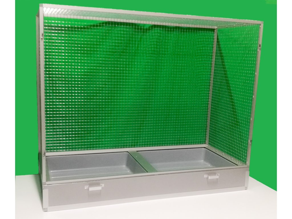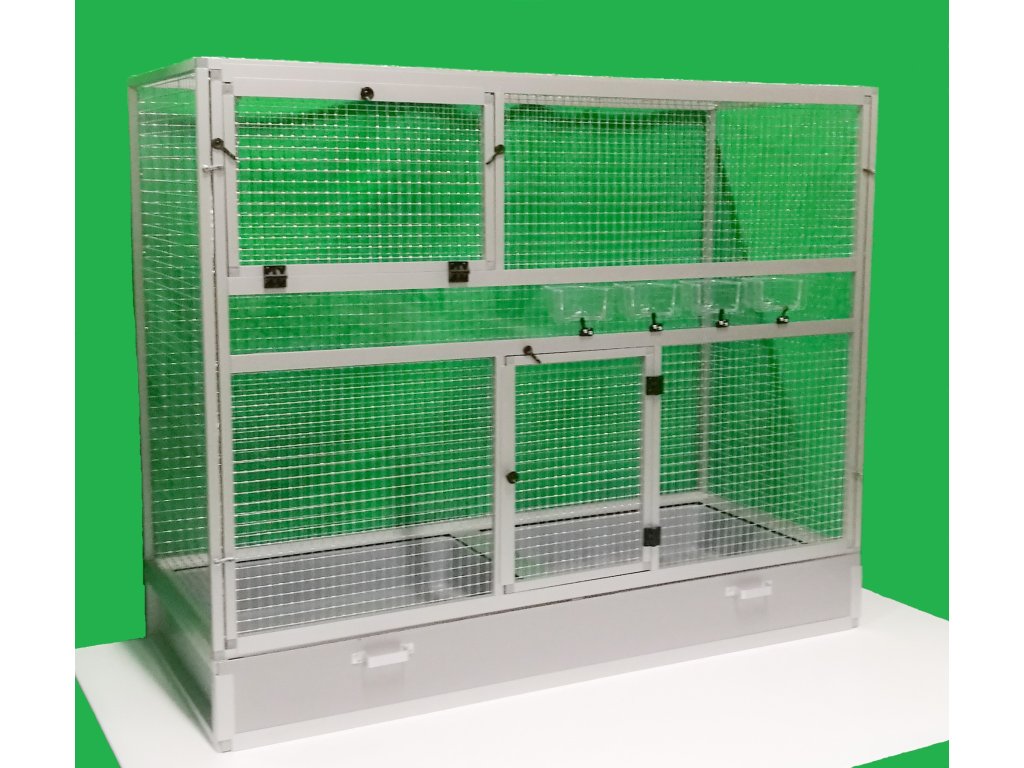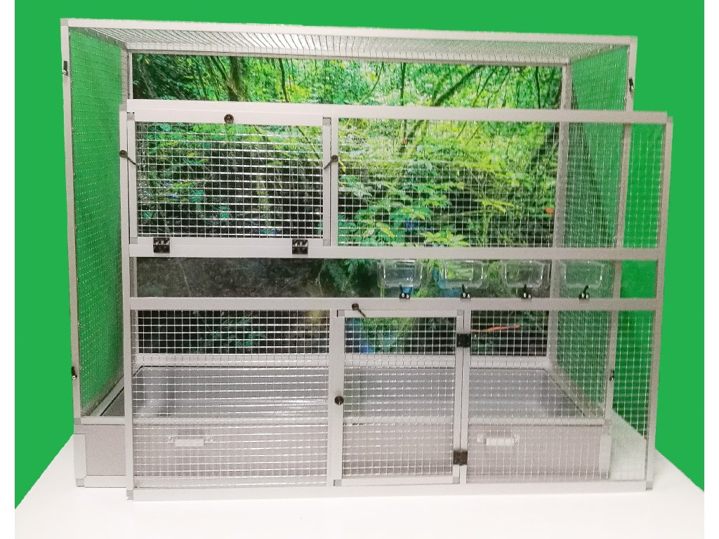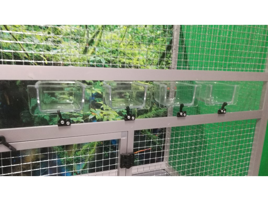 Přední stěna je vybavena pěti zásuvnými průhlednými krmítky. Konstrukce klece je vyrobena z hliníkových profilů s povrchovou úpravou stříbrný elox.