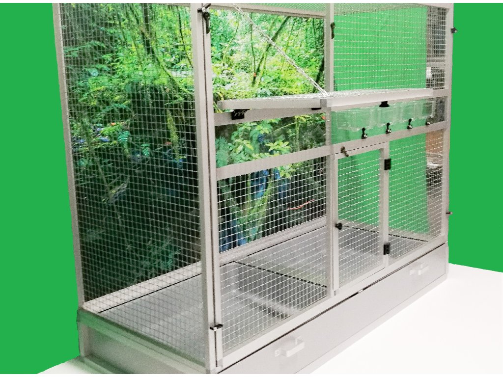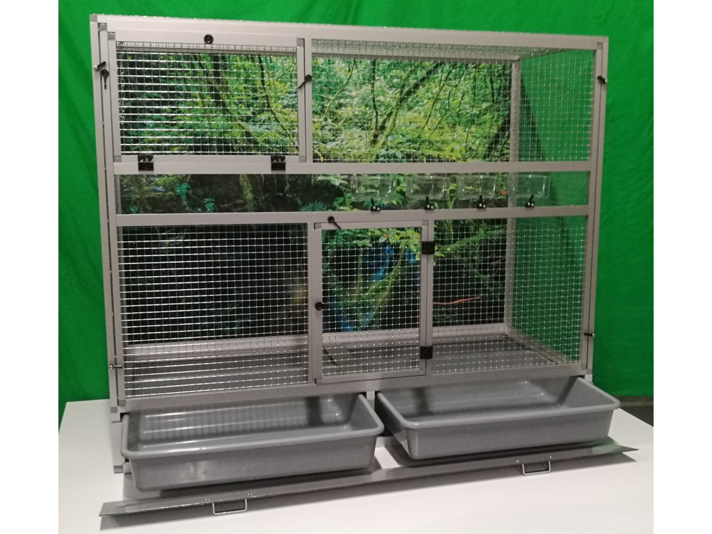 Klec je postavena na samostatném podvozku, který je vybaven dvěma plastovými vaničkami. Manipulace s vaničkami při čištění klece je velmi snadná. Vanička je 18 cm hluboká, což dostatečně umožňuje udržet pořádek v okolí voliéry.
