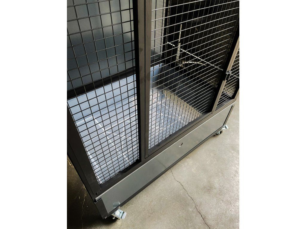 Klec není rozebíratelná, skládací. Zadní stěna může být za příplatek polepena tapetou dle výběru z pěti nabízených variant. Tapeta je laminována a tím chráněna proti oděru. Klec je postavena na samostatném podvozku, který je vybaven plastovou vaničkou, se kterou se velmi dobře manipuluje při čištění klece. Vanička je 18 cm hluboká, což dostatečně umožňuje udržet pořádek v okolí voliéry. Přední stěna je vybavena zásuvným krmným pultem s gastronádobami. Na našich stránkách má označení KPZ10. Konstrukce klece je vyrobena z hliníkových profilů s povrchovou úpravou eloxováním (černý elox.). Použito velmi kvalitní osvědčené pletivo značky Esafort 19x19x1,45 mm. Na přání je možno klec dovybavit roštem nad vaničkou.