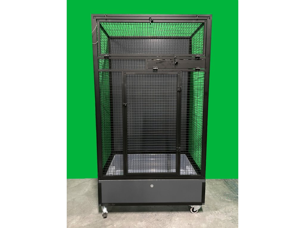 Klec je určena pro drobnější druhy krotkých papoušků. Krmné pulty jsou zásuvné a lze je vyjmout pouze zvenku. Tímto způsobem jsou zabezpečeny proti vytažení zvířetem v kleci. Nad krmným pultem je výklopné okno pro osobní kontakt se zvířetem.