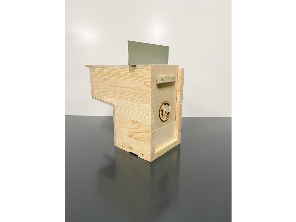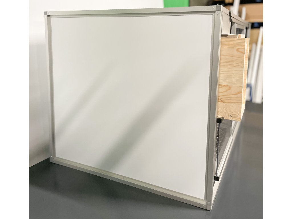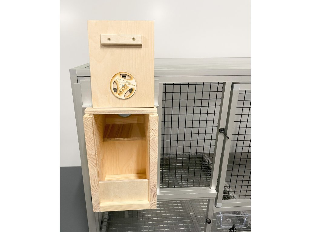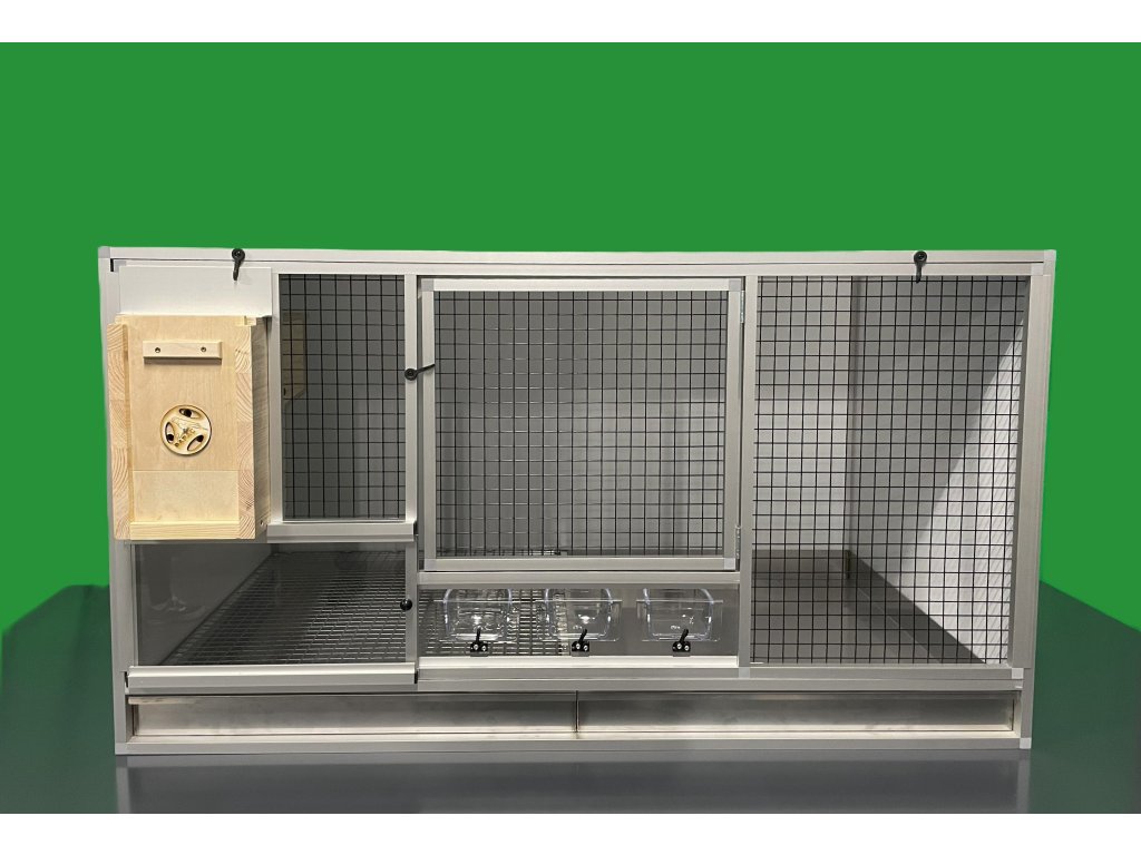 Klece vyrábíme v šedé a bílé barvě. Rozměry klece: š 119,5 cm, hloubka 70 cm, výška 65cm. Celková váha klece včetně budky je 27,5 kg. Váha samostatného korpusu bez mřížky je 14 kg. Korpus je vyroben z hliníkových sendvičů zasazených do profilu Aluhobby. Přední mřížka je samostatná / vyndavací. Je potažena italským pletivem Esafort, oko 19x19, drát 1,5 mm. Pletivo je načerněno do matné barvy. Díra pro budku má samostatná dvířka. Součástí klece jsou dva nerezové šuplíky. Pod mřížkou, ve které je posuvné plexisklo je umístěn šuplík s mřížkou. Druhý šuplík mřížku nemá.
