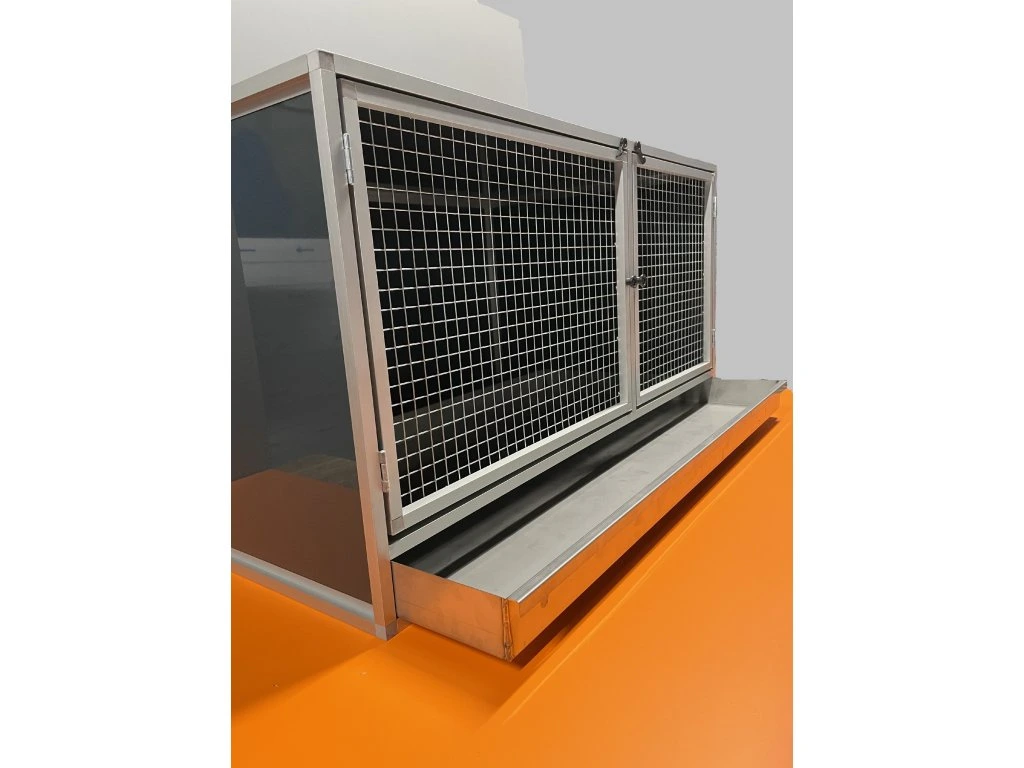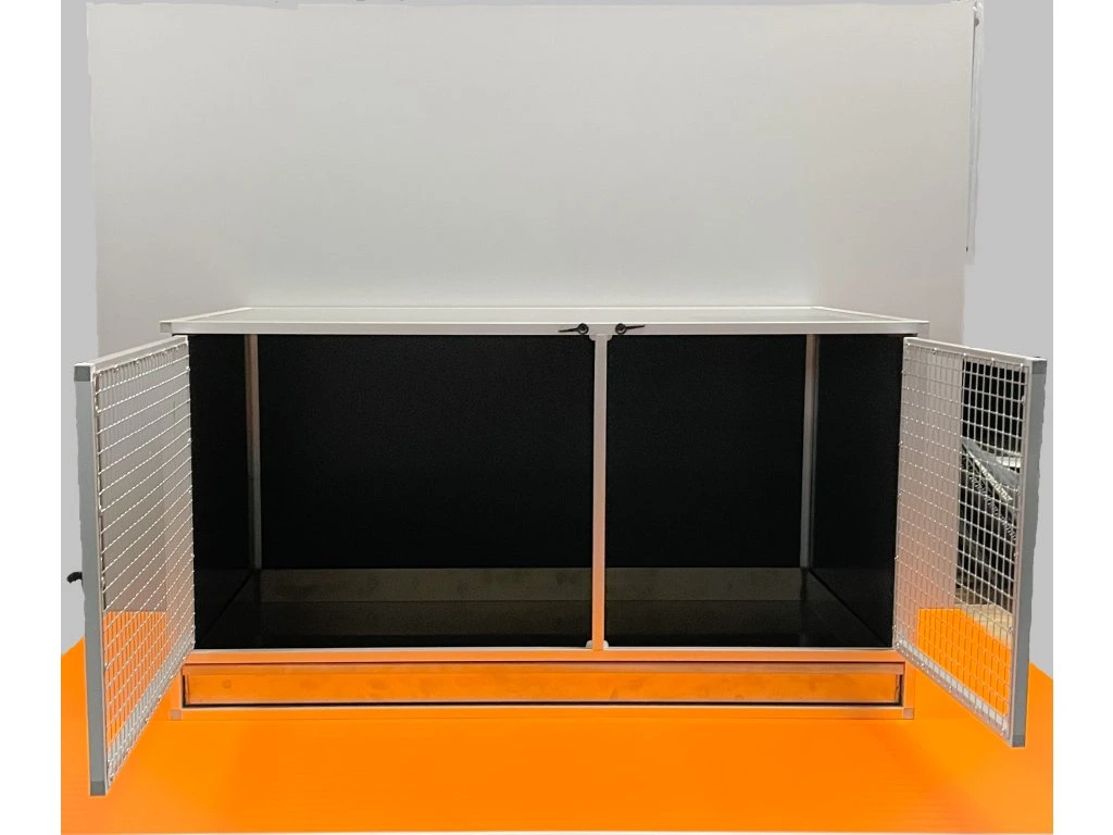 Rozměry klece: výška 54,5 cm, šířka 100,5 cm, hloubka 62,5 cm. Rozměry půdorysu jsou dané možnostmi nerezového šuplíku.