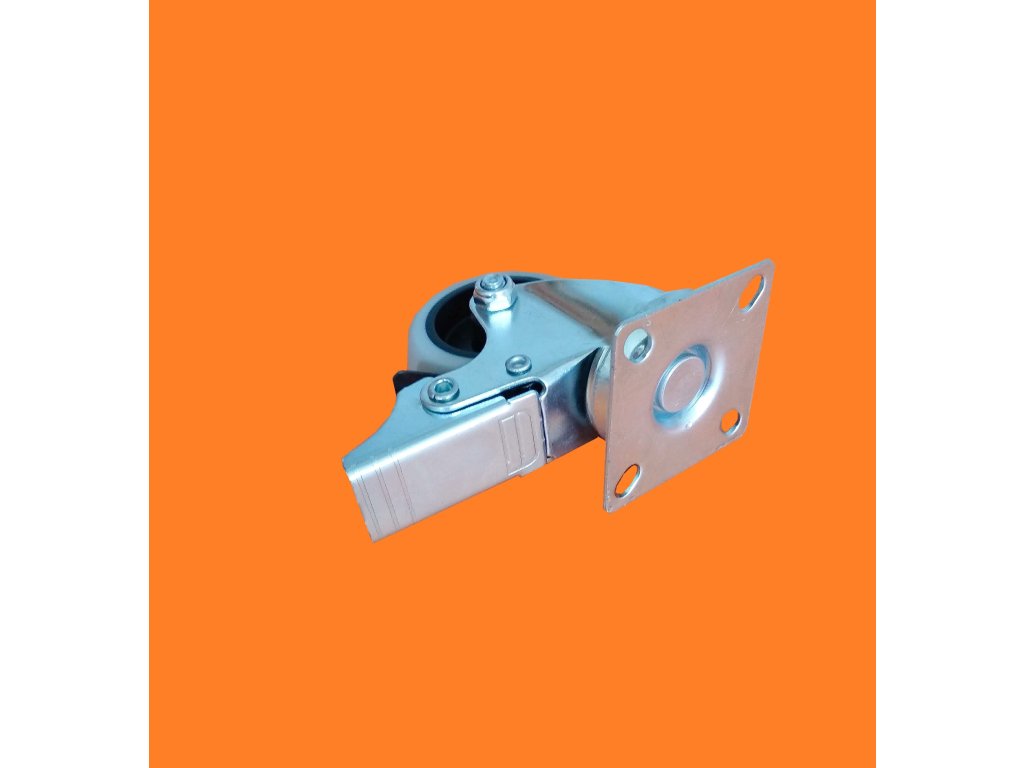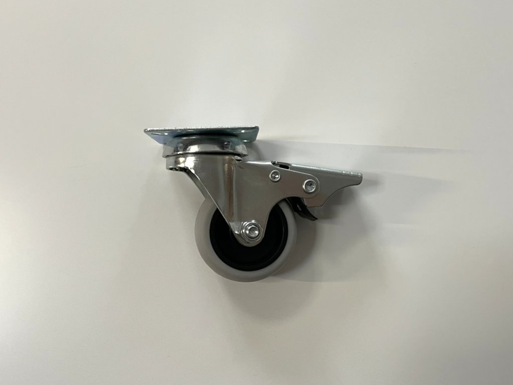 Kolečko s otočnou vidlicí a upínací deskou. Materiál kola: polyamid, běhoun kolečka šedá pryž.