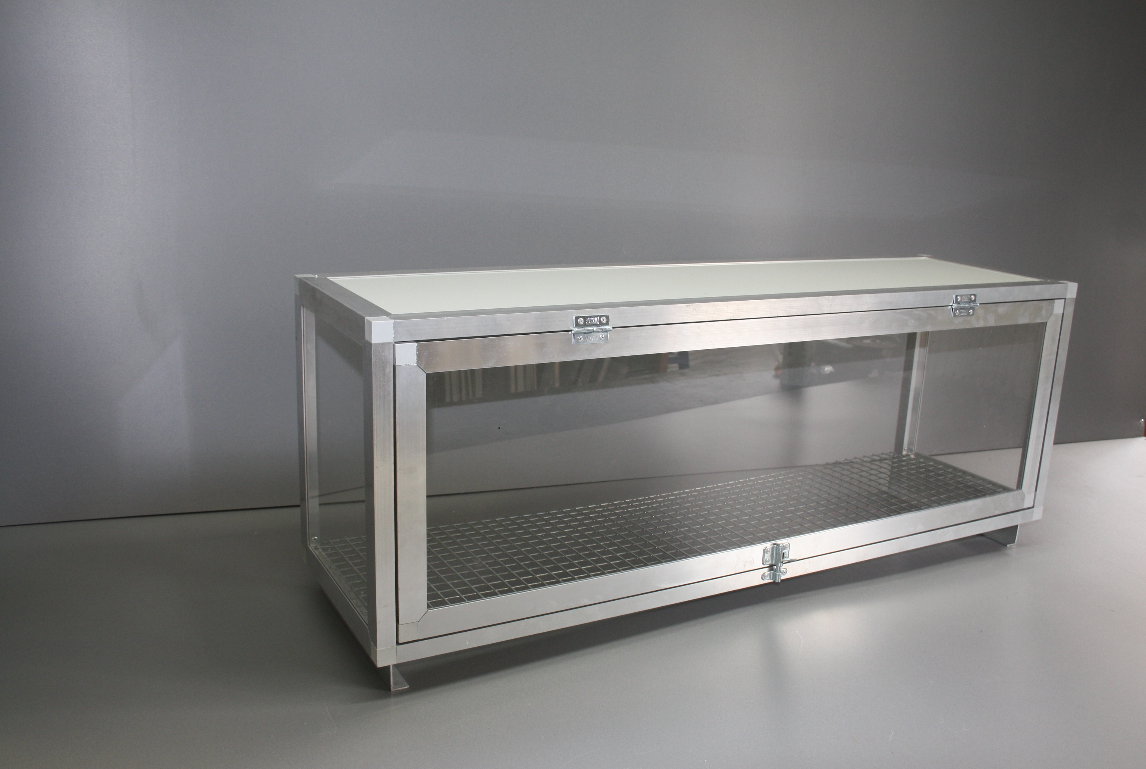 Krmný box je samostatná součást přední stěny voliér. Krmný box je samostatný a je na rám stěny přišroubován šrouby č.6, v rámu samotném jsou nanýtovány hliníkové závity pro přesné uchycení boxu. Box dodáváme i samostatně. Hliníkové profily HJ20V, které jsou použity k výrobě, umožňují vložení plexiskla do stěn a hliníkového kompozitu na strop boxu bez použití nýtů. Což vypadá velmi efektně, ale vyznívá i z praktického hlediska udržení hygieny velmi příjemně. Díky hliníkovému kompozitu na stropě boxu vzniká i pevný odkládací prostor. Naopak plexisklo umožňuje chovateli sledovat chování ptactva při krmení. Součástí krmného boxu je i síto. Díky tomuto vloženému sítu nemají zvířata přístup k již jednou znehodnocenému krmivu. Krmný box lze zakoupit i bez šuplíku. Krmivo pak padá volně do prostoru krmné chodby.