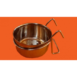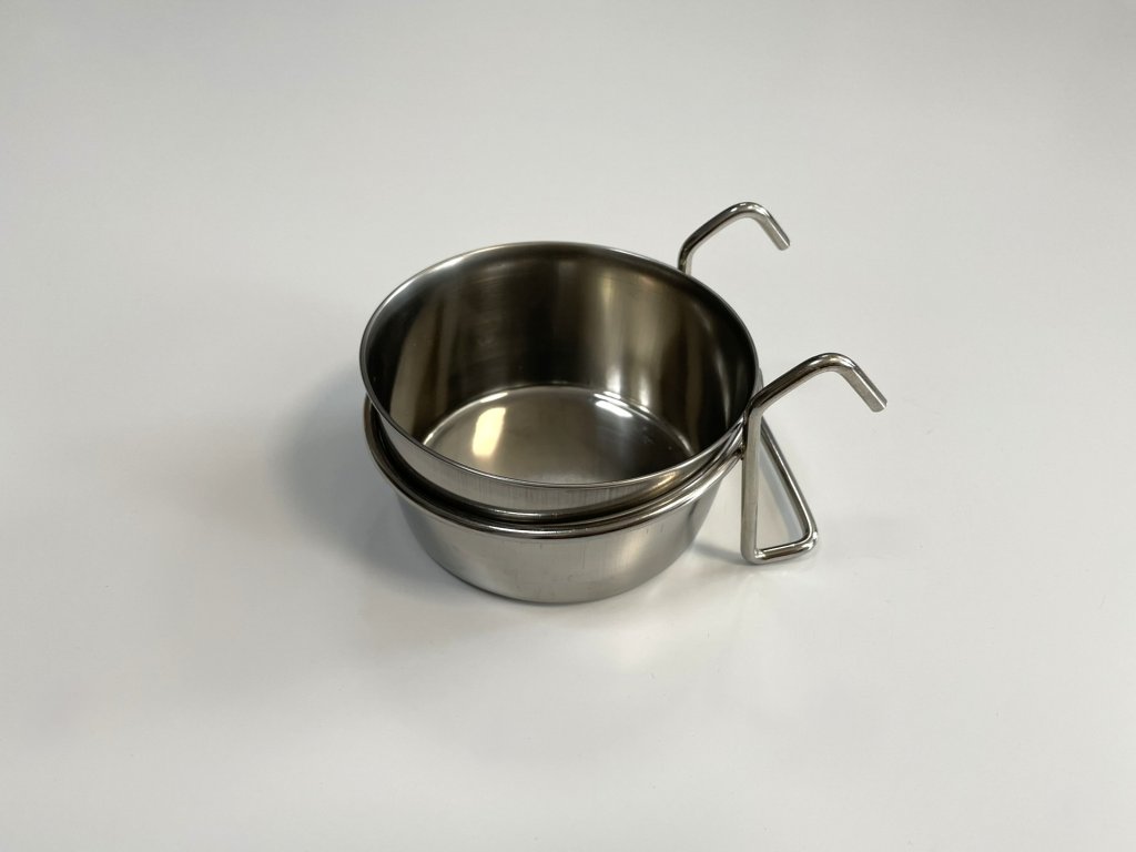 Závěsná nerezová miska do klecí pro ptáky. Průměr: 8,3 cm, výška 4,4 cm, objem 210 ml.