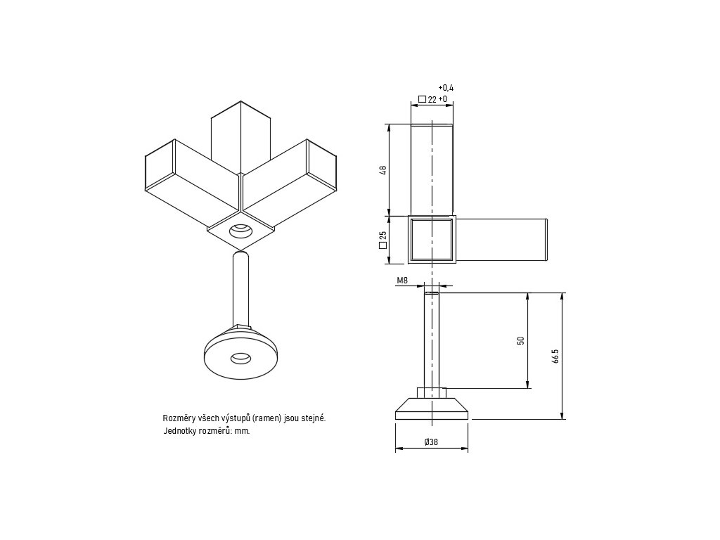 U této spojky je matice M8, která se dá využít pro našroubování nožky. Cena nožky je 30,-Kč.