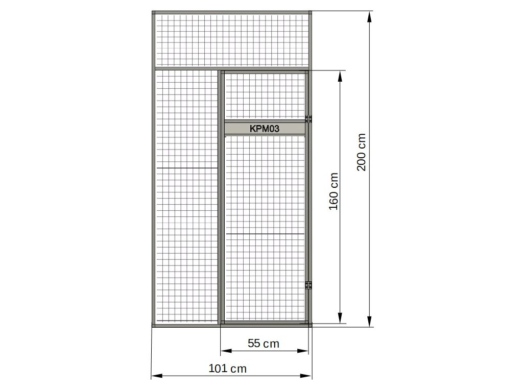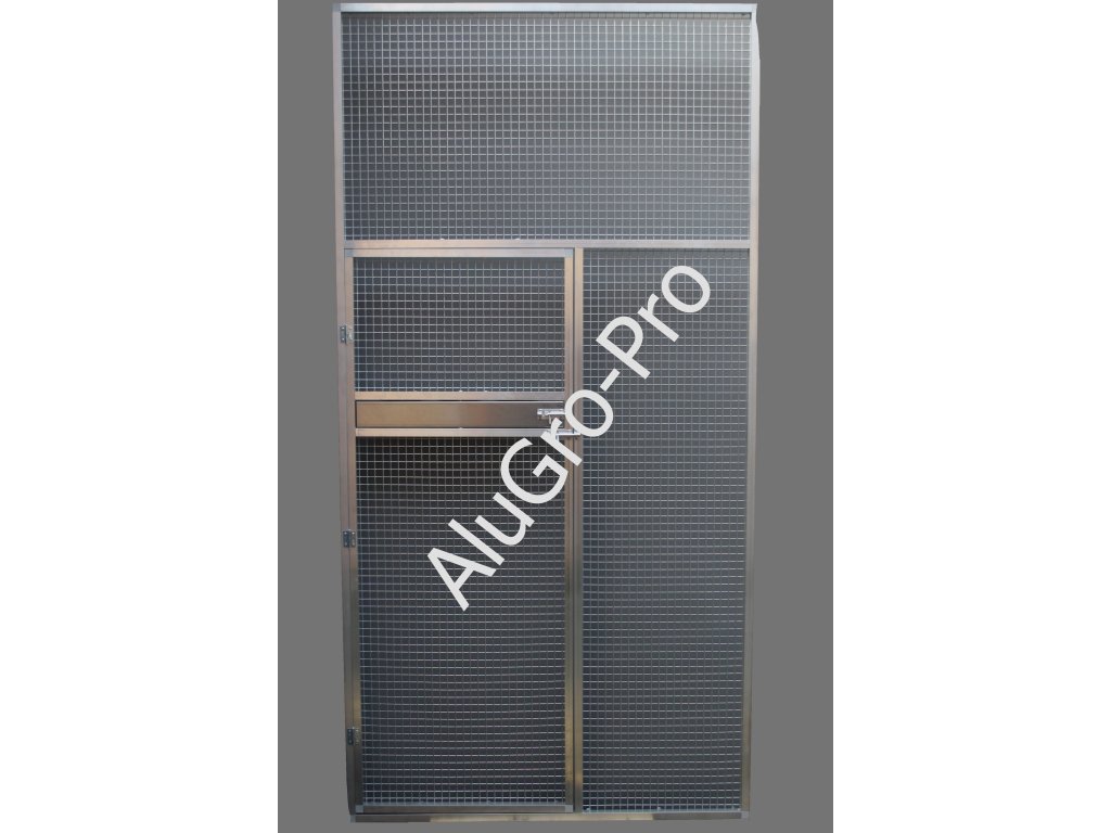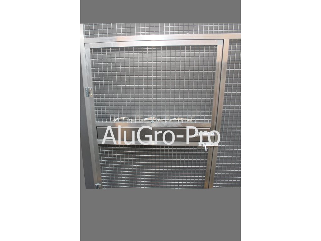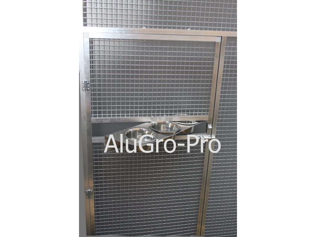 Přední stěna, kdy otočný krmný pult se třemi nerezovými miskami je uložen ve dvířkách voliéry. Dvířka mají na výšku 140cm, na šířku 55cm. Hliníkový rám je potažen pletivem Esafort 19x19x1,45mm. Na přání zákazníka lze použit i jiná pletiva z naší nabídky. Deska krmného pultu je hliníková, síla materiálu 2mm.