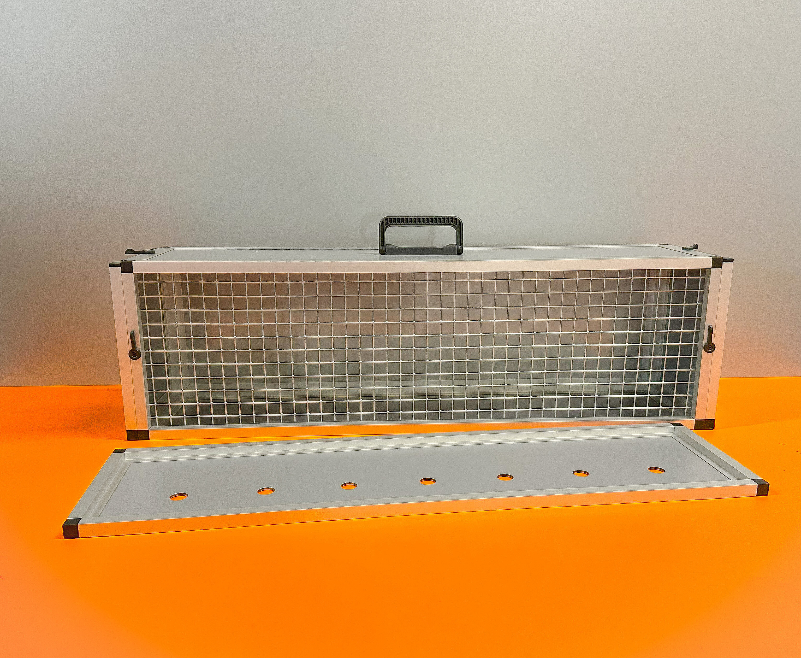 Přepravní box – tubus je určen pro přepravu papoušku druhu Ara. Použité materiály jsou velice kvalitní a omyvatelné. Použité pletivo oko 19x19 síla drátu 2mm Přední stěna, záklop jdou lehce vyjmout. Tubus je vyroben z profilu 15x15x1 mm s povrchovou úpravou elox. Rozměry přepravního tubusu jsou šířka 83 cm, hloubka 20 cm, výška 24 cm. Výplně přepravky jsou vyrobeny z hliníkového sendviče. Barva může být stříbrná, zelená, bílá, antracitová. Celková váha přepravky je pouze 4,5kg. Na přání může být přepravka delší případně i jiných rozměrů.
