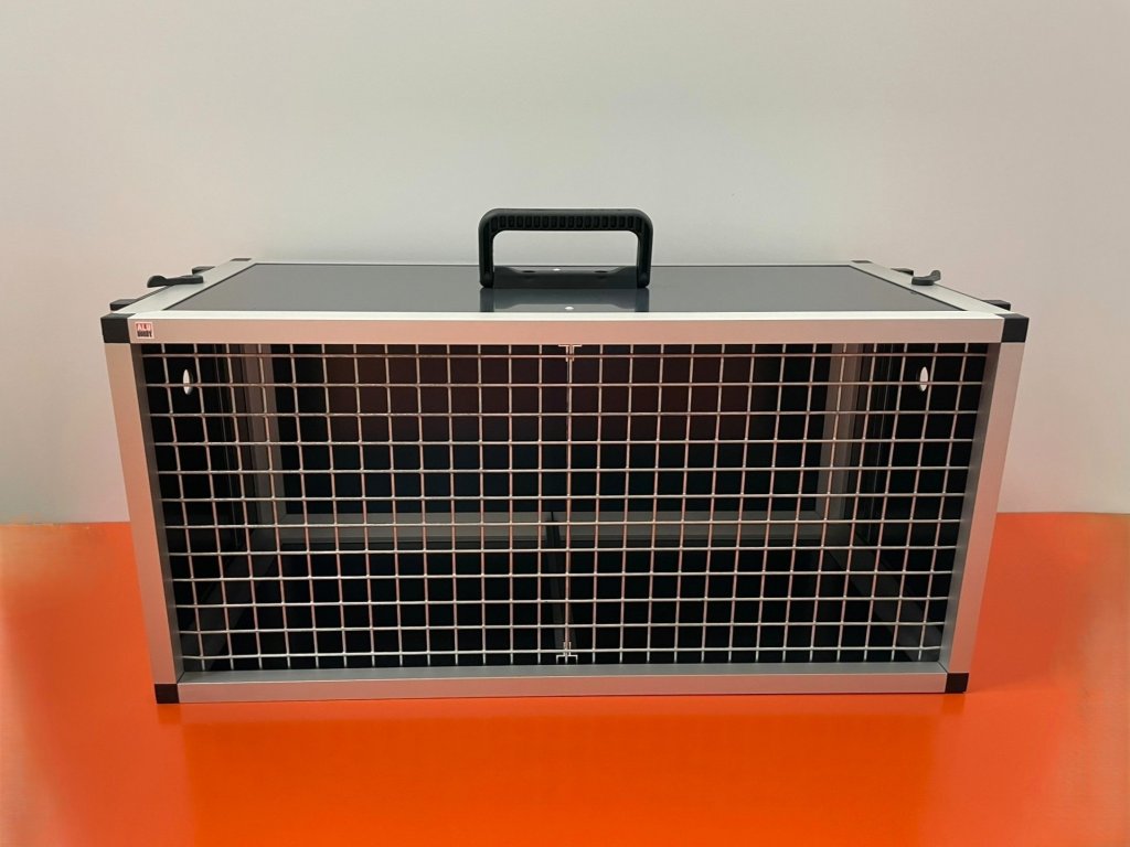 Přepravní box box Lori 2 o rozměrech: šířka 58 cm, hloubka 27 cm, výška 26 cm, je vyroben pro přepravu více zvířat. Box má dva samostatně oddělené prostory. Je vyroben z hliníkových profilů s povrchovou úpravou stříbrný elox. Plné stěny tvoří hliníkový sendvič v černém provedení. Pletivo v přední stěně je značkové pletivo Esafort oko 19x19 drát 2,05 mm.