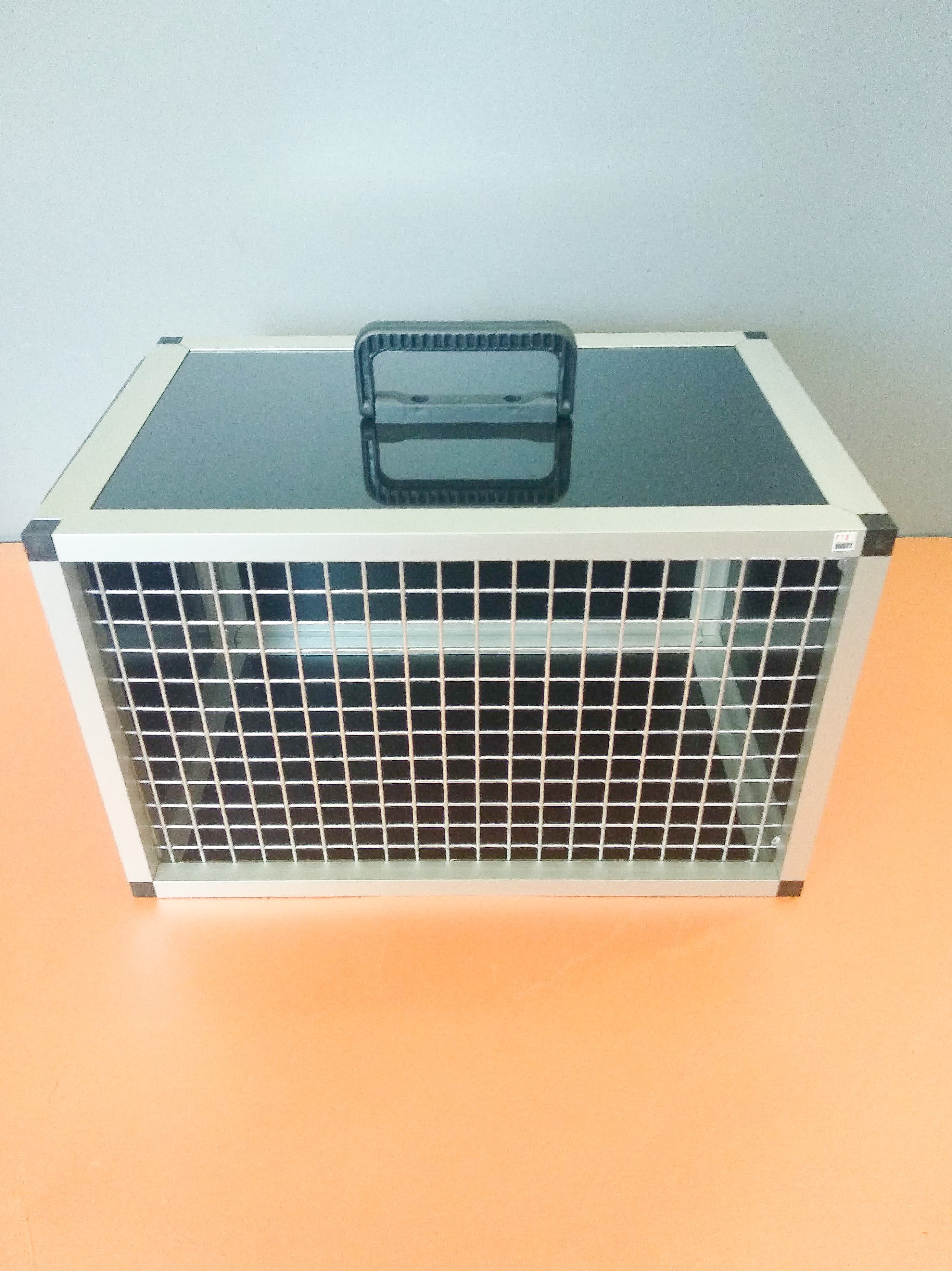 Přepravní box Box Lori v černém provedení o rozměrech šířka 41,5cm, hloubka 27cm, výška 26cm. Je vyrobena z hliníkových profilů s povrchovou úpravou stříbrný elox. Plné stěny tvoří hliníkový sendvič v černém provedení. Pletivo v přední stěně je značkový Esafort oko 19x19 drát 2,05 mm. Přepravní box je velice odolný a je vhodný i pro větší papoušky typu žako, amozoňan, sengálec atd. Přepravní box je omyvatelný. Dá se lehce dezinfikovat. Působí velice elegantně a čistě. Váha 2,5kg.