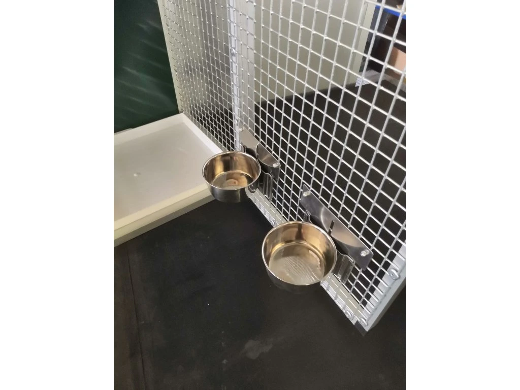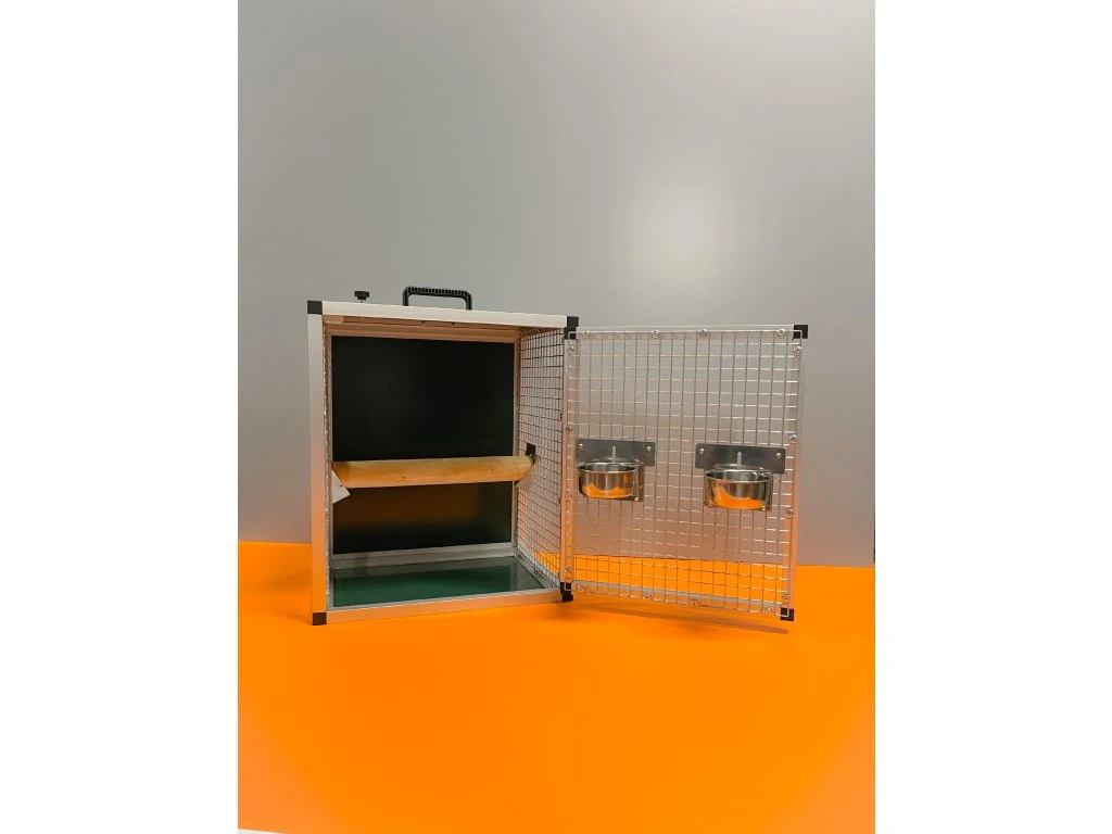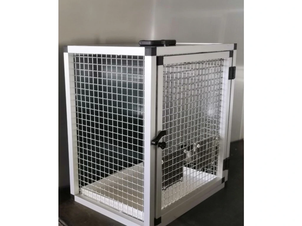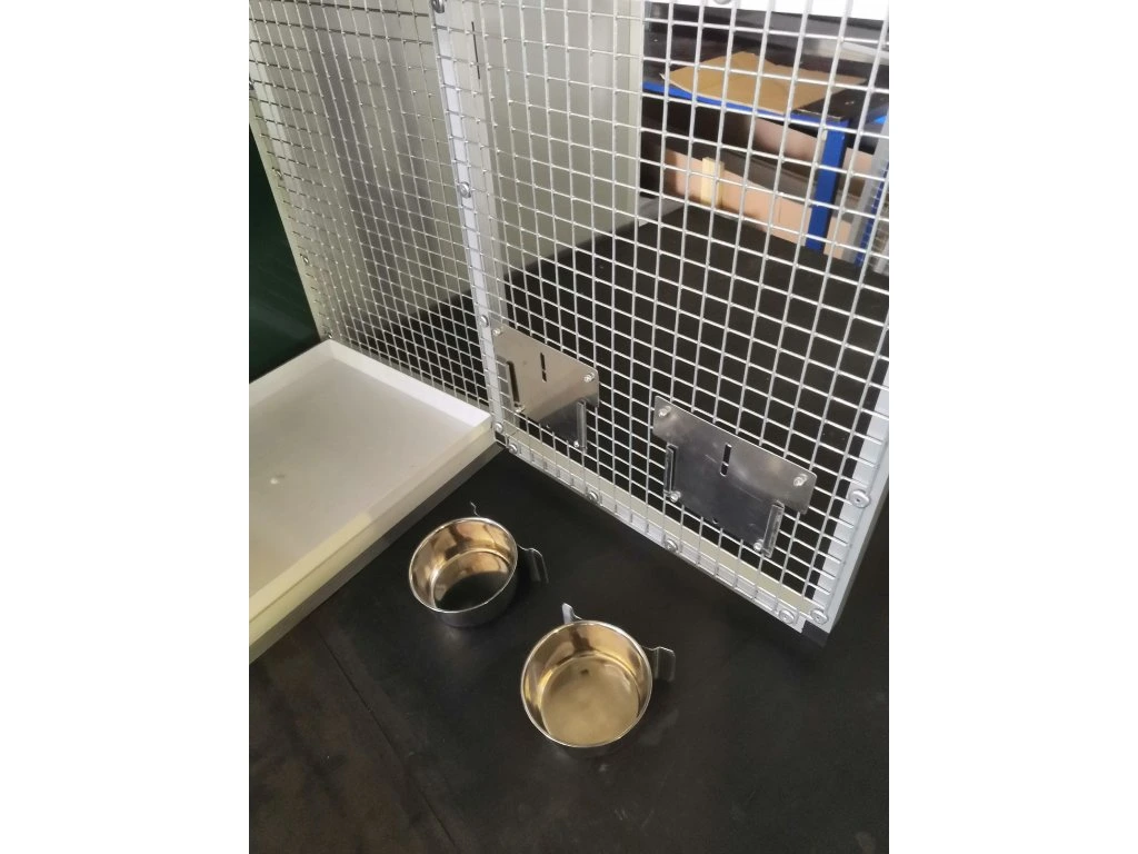 Výplně přepravky jsou vyrobeny z hliníkového sendviče. Použito je italské pletivo Esafort oko 19 x 19 drát 2,05 mm. Přední dvířka jsou zabezpečena šroubem s plastovou hlavou - proti otevření. Nerezová krmítka lez při přepravě zvířete vysunout.