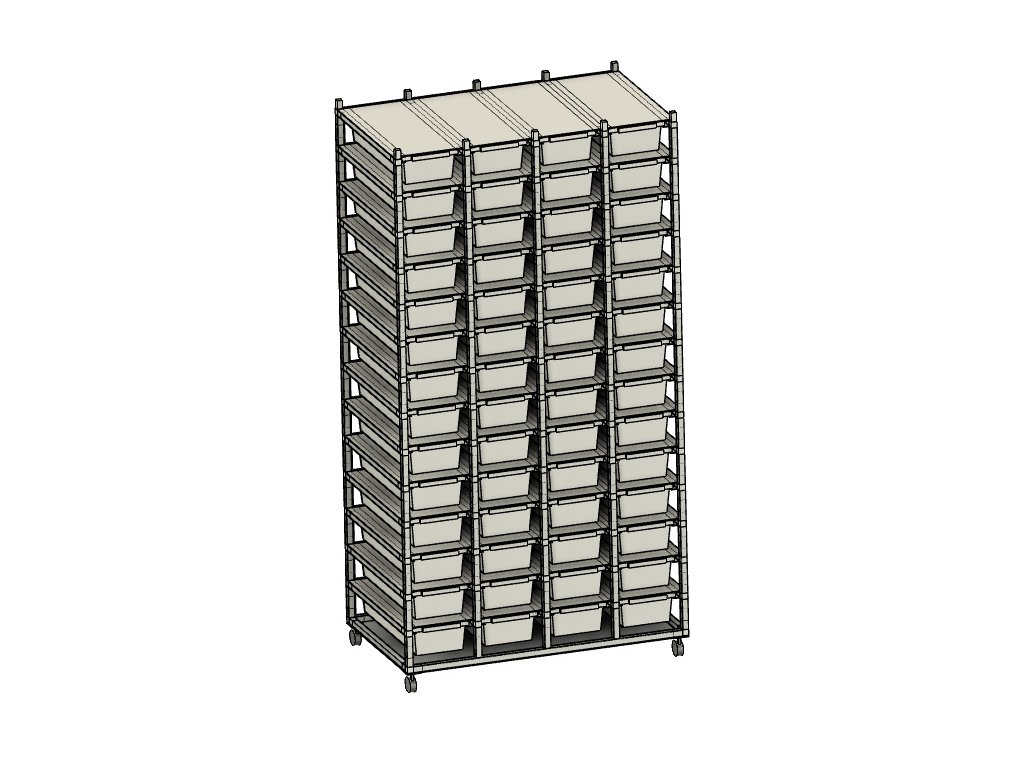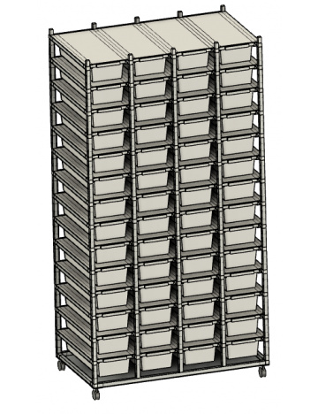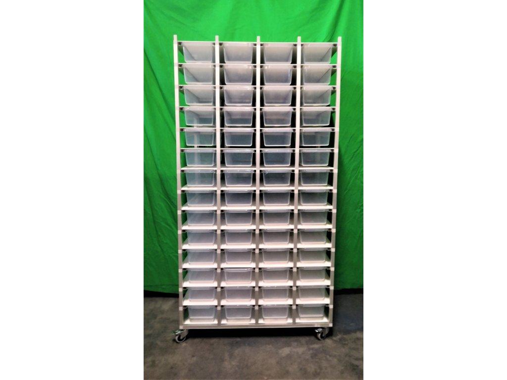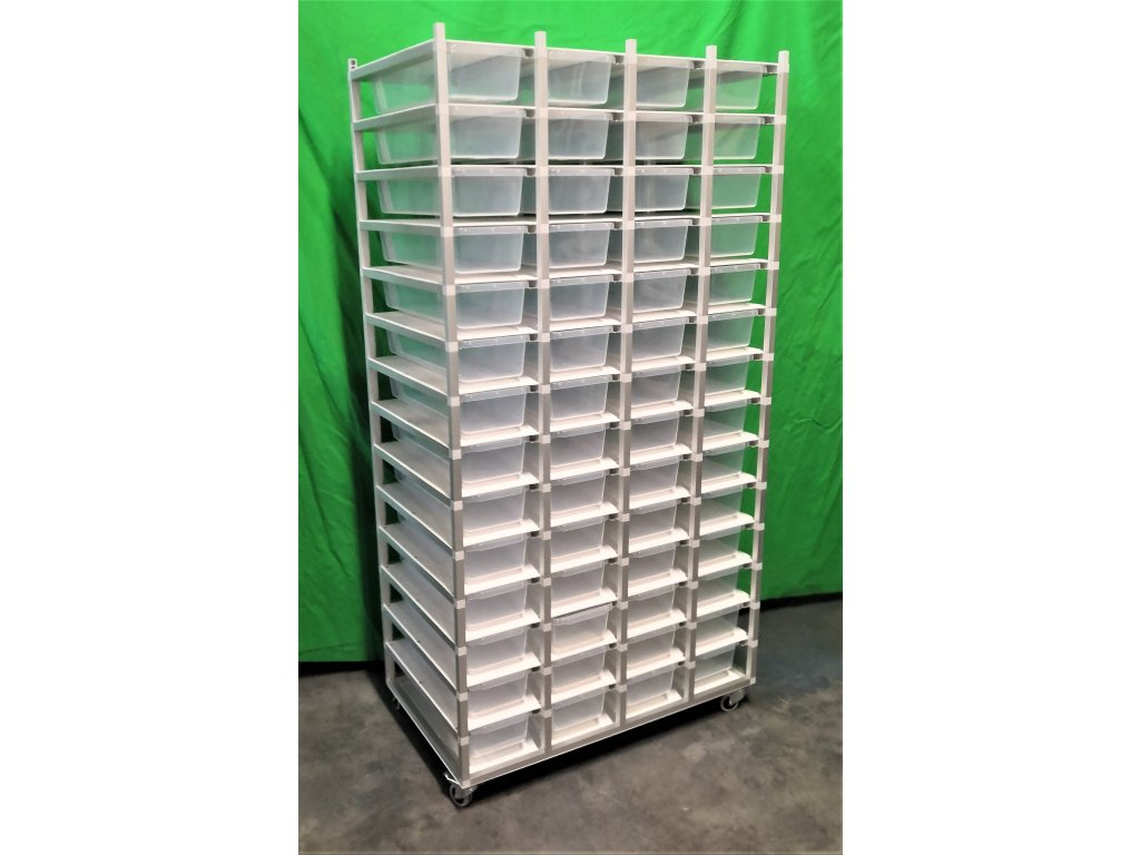 Chovatelský regálový Rack systém je často využíván ke komerčním ale i k hobby chovům. Regál je určeny pro plastové boxy o rozměru š 19, h 51, v 10 cm. Výška racku 56 beden včetně koleček je 180 cm, šířka 94 cm, hloubka 54,5cm. Kolečka s gumovou pryží a brzdou umožňují velmi jednoduchý a lehký pohyb s celým regálem. Váha regálů včetně beden 60 kg Na přání zákazníka umíme Rack vyrobit na počet boxů jak do výšky, tak do šířky podle požadavků chovatele. Rovněž lze Rack zhotovit z profilů s eloxovaným povrchem. Do každého patra lze vkládat topné fólie pod chovné boxy. Boxy jsou součástí Racku.
