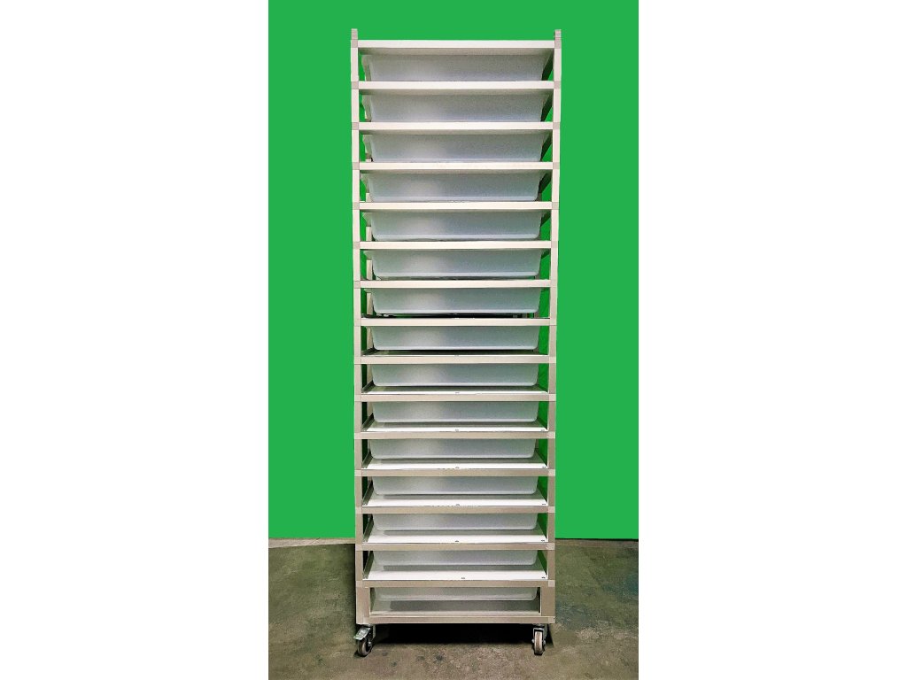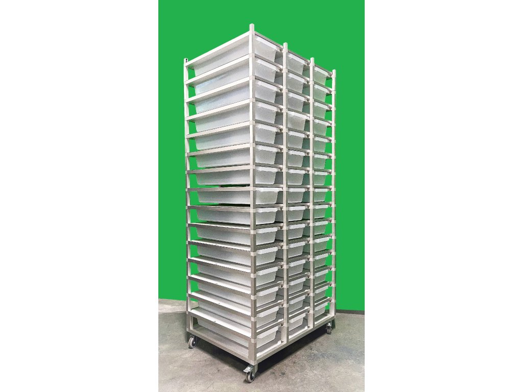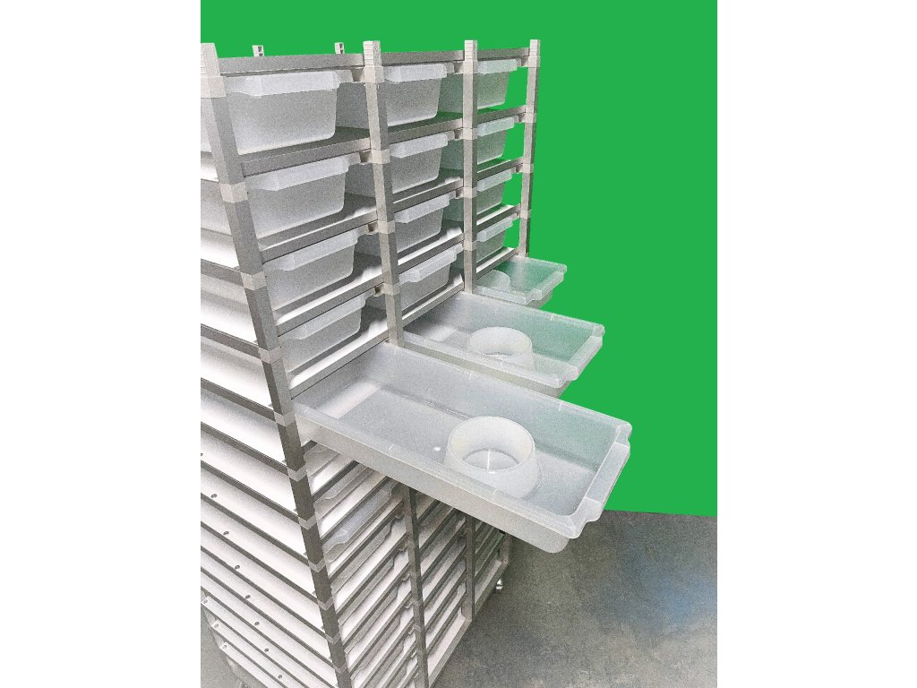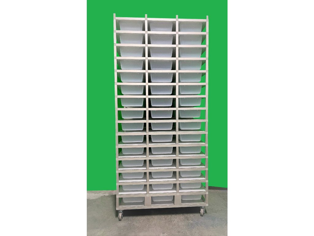 Chovatelský regálový Rack systém je často využíván ke komerčním i k hobby chovům. Jednotlivé bedny jsou zavěšeny v racku, stropy jsou z hliníkového sendviče. Jedná se o velmi odolný materiál. Do tohoto materiálů je možné odvrtat dírky různých průměrů - pro odvětrání. Kolečka s gumovou pryží a brzdou umožňují velmi jednoduchý a lehký pohyb s celým regálem. Na přání zákazníka můžeme Rack upravit jak do šíře, tak do výšky a počtu boxů.