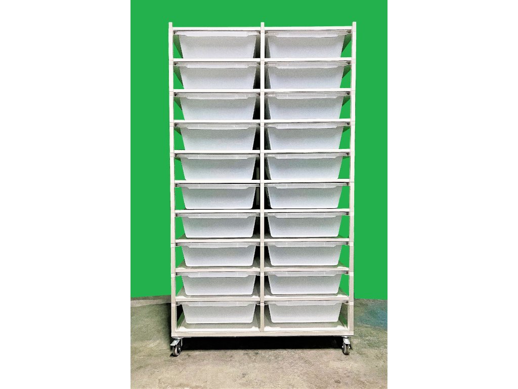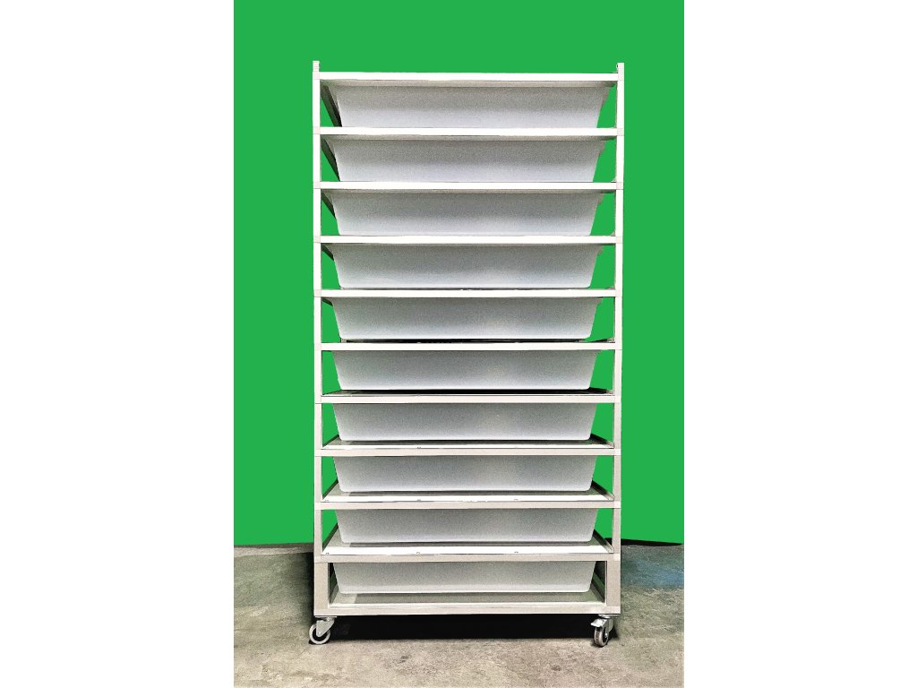 Chovatelský regálový Rack systém je často využíván ke komerčním i k hobby chovům. Jednotlivé bedny jsou zavěšeny v racku, stropy jsou z hliníkového sendviče. Jedná se o velmi odolný materiál. Do tohoto materiálu lze odvrtat dírky různých průměrů pro odvětrání. Kolečka s gumovou pryží a brzdou umožňují velmi jednoduchý a lehký pohyb s celým regálem. Na přání zákazníka můžeme Rack upravit jak do šíře, tak do výšky a počtu boxů.