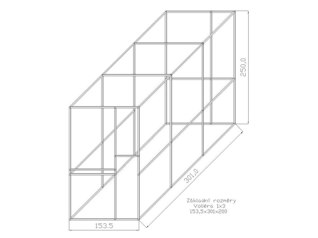 Šíře jednoho boxu je cca 153 cm. Konstrukce po sestavení tvoří jeden celek. Na vyžádání můžeme dodat konstrukci i ve stříbrném eloxovaném provedení, kde se cena konstrukce navýší o cca 13 %. Součástí stavebnice jsou dvířka do voliéry, panty a petlička. Rozměry samotných dvířek jsou: výška 134 cm, šíře 48 cm. Součástí stavebnice je rovněž krmný nerezový pult, kde zákazník má na výběr ze tří typů KPG05 , KPG07, KPG11. Vždy se jedná o krmné pulty zásuvné nerezové s gastronádobami. Gastronádoby mají na výšku 6 cm. Krmný pult KPG 11 jako jediný nabízí i možnost záměny misek s menší hloubkou. Místo 6 cm na 4 cm. Vybraný typ je potřeba uvést do poznámek. Tyto krmné pulty oproti otočným krmným pultům mají hned několik výhod. Nádobu z krmného pultu nelze zvířetem vytáhnout. Před krmným pultem lze umístit bidlo. Nádoby mají pro svůj tvar elipsy a hloubku větší obsah než misky kulaté. Pletivo a úchytový materiál, není součástí stavebnice.