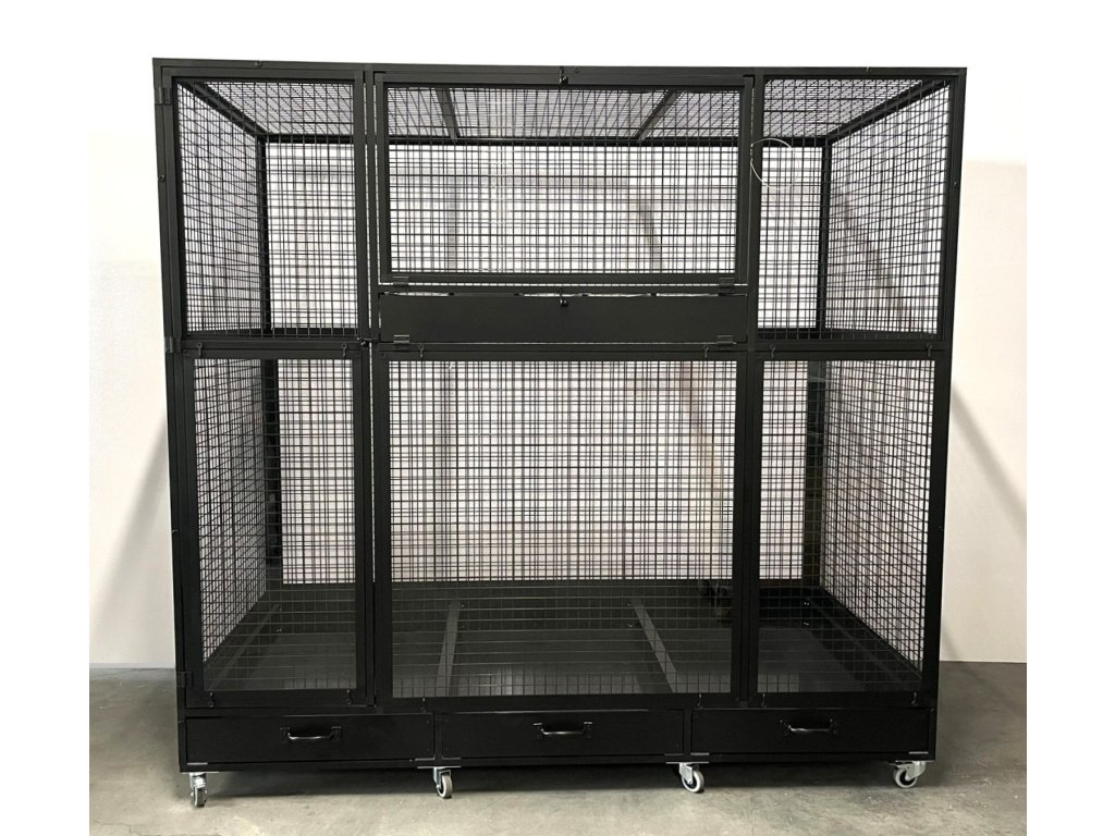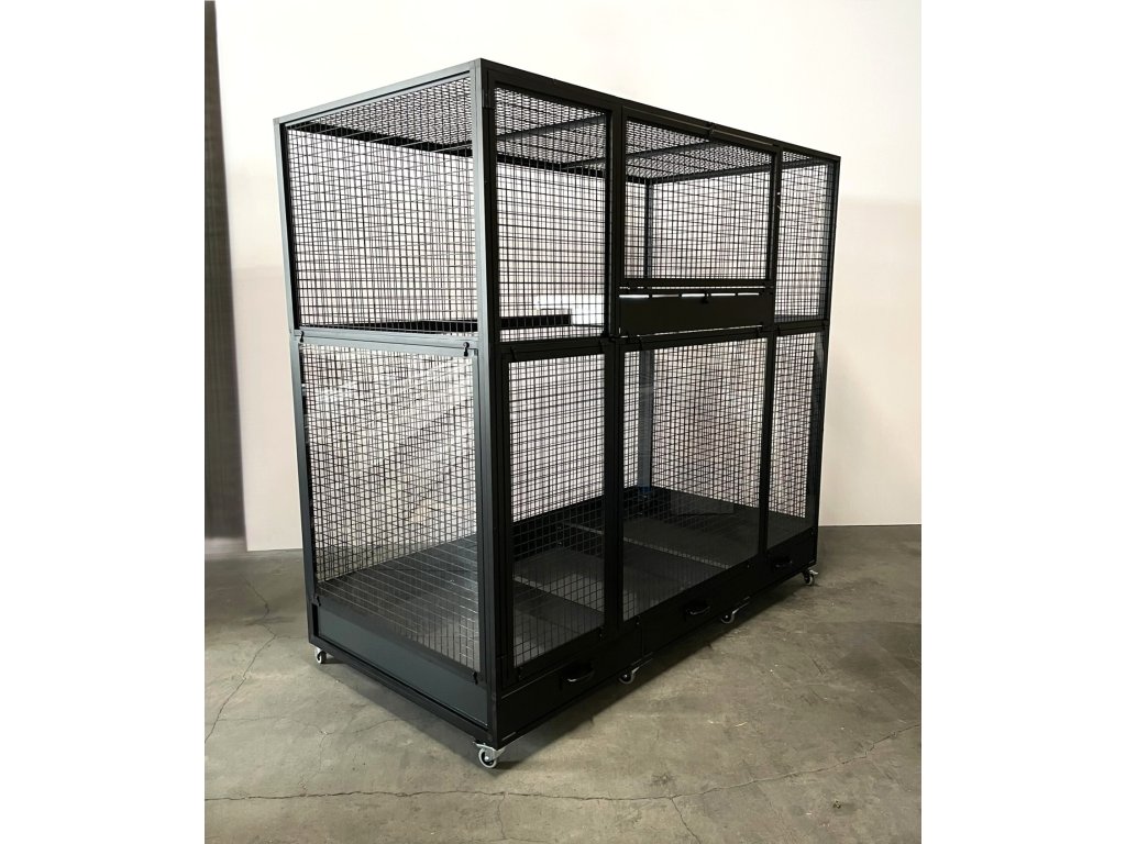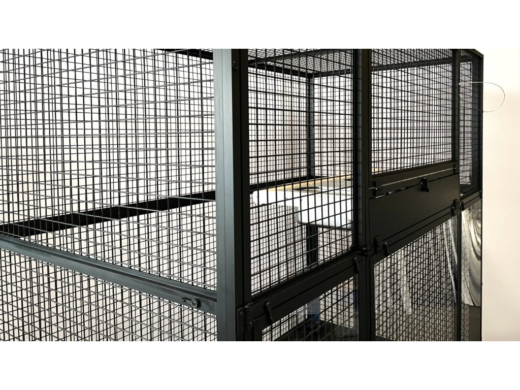 Přední stěna má výletové okno. Konstrukce voliéry je vyrobena z hliníkových profilů s povrchovou úpravou - eloxováním. Použita jsou galvanicky zinkovaná síta v barvě černé. Na přání mohou být také stříbrná. Galvanicky zinkovaná síta do černé barvy jsou naší specialitou. Černá barva zinku není běžně používaná. Pohled přes síto na zvíře uvnitř voliéry je opravdu výjimečný. Na přání můžeme nabídnout i takzvané záklopy. Záklopy umožňuji udržet maximální čistotu v okolí voliéry.