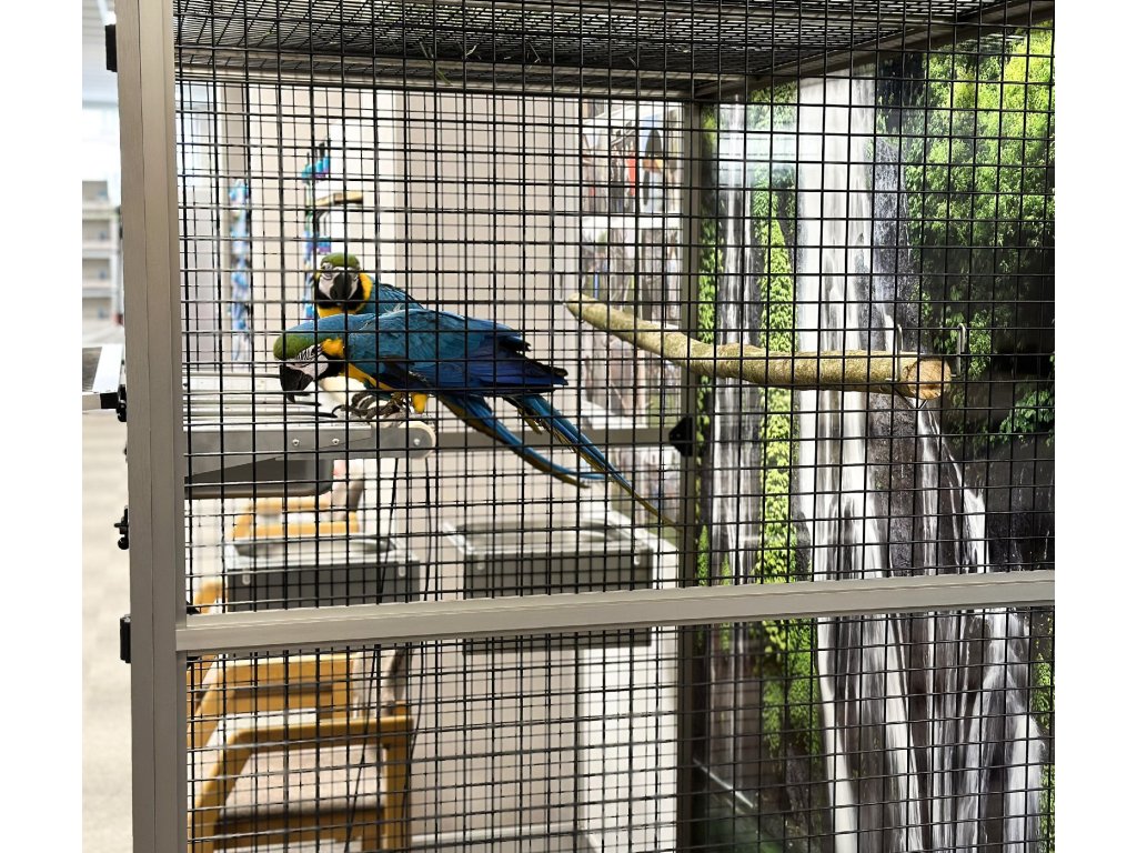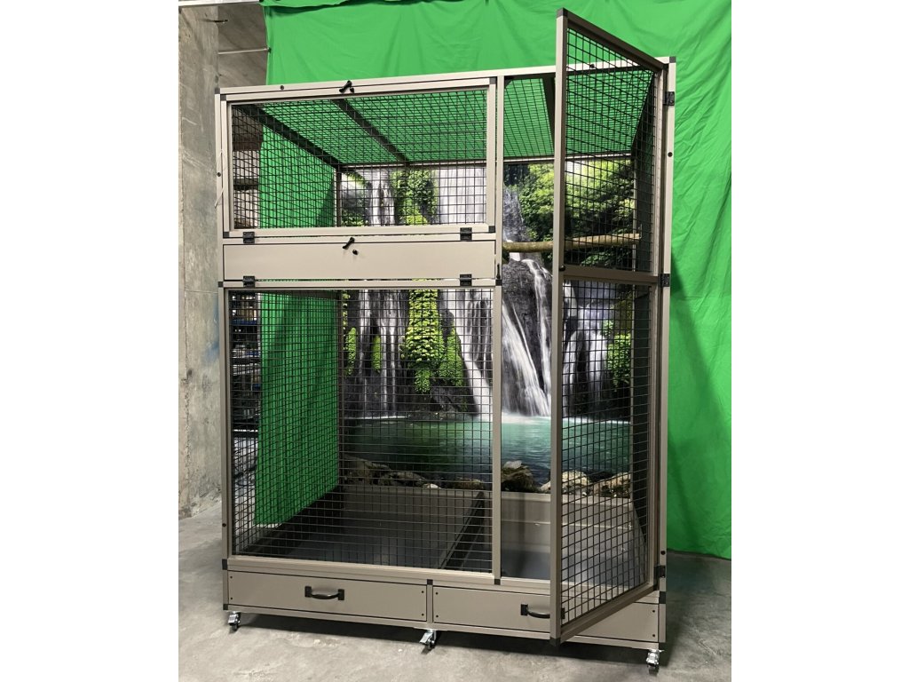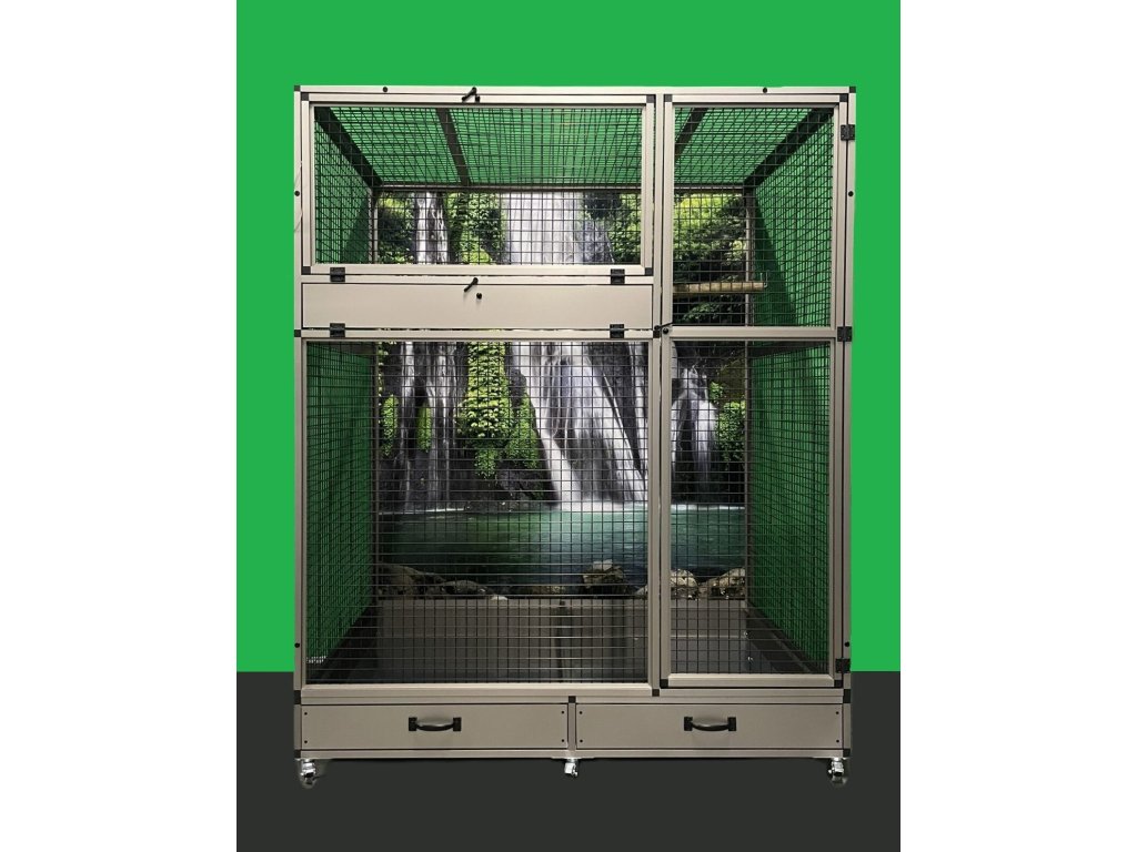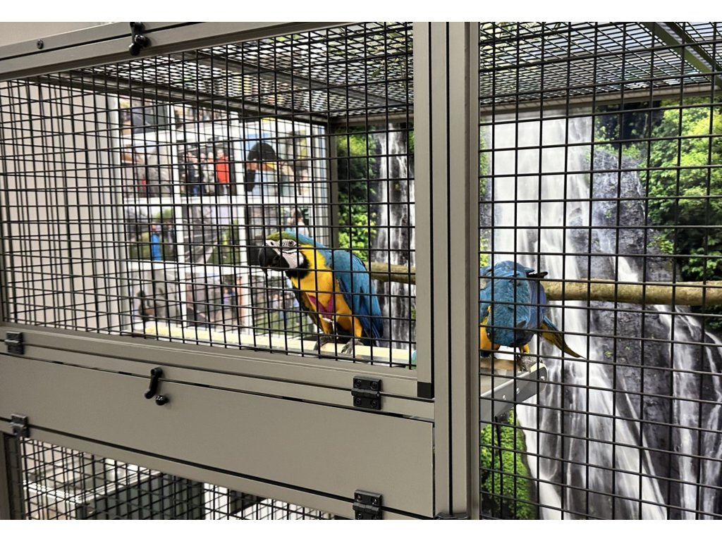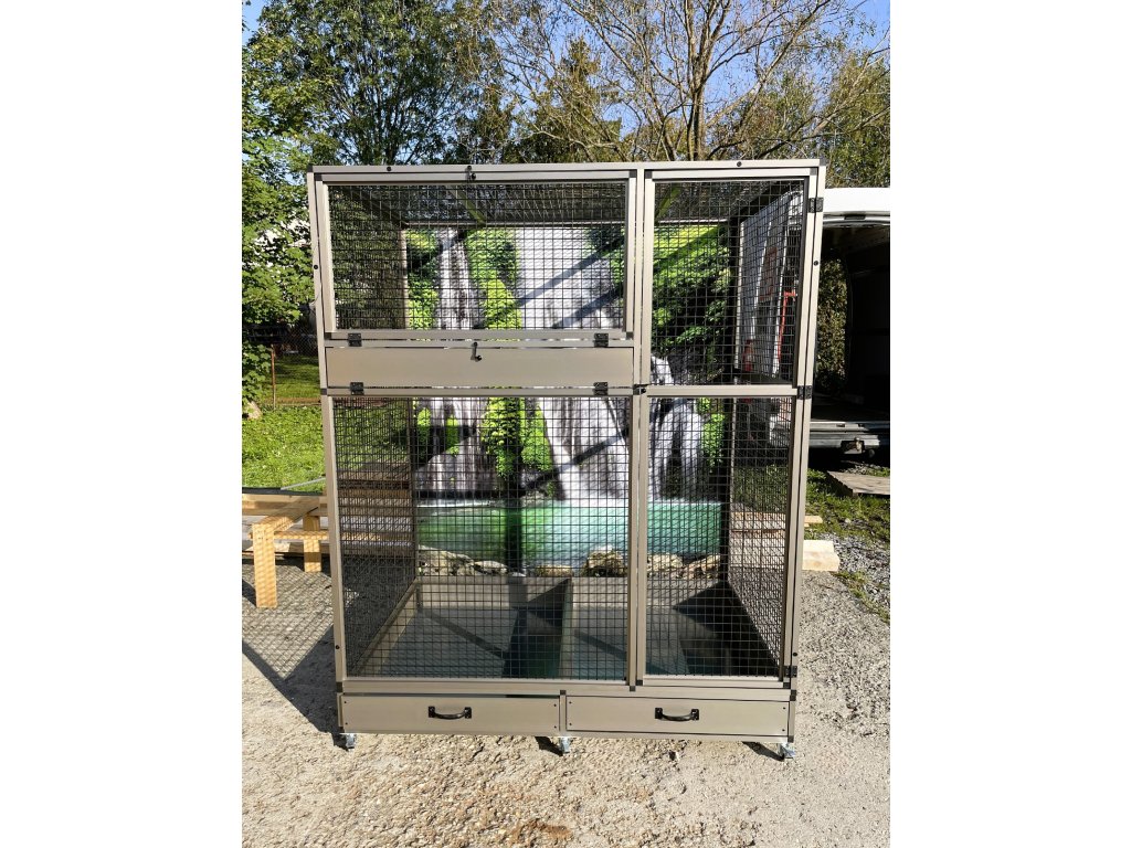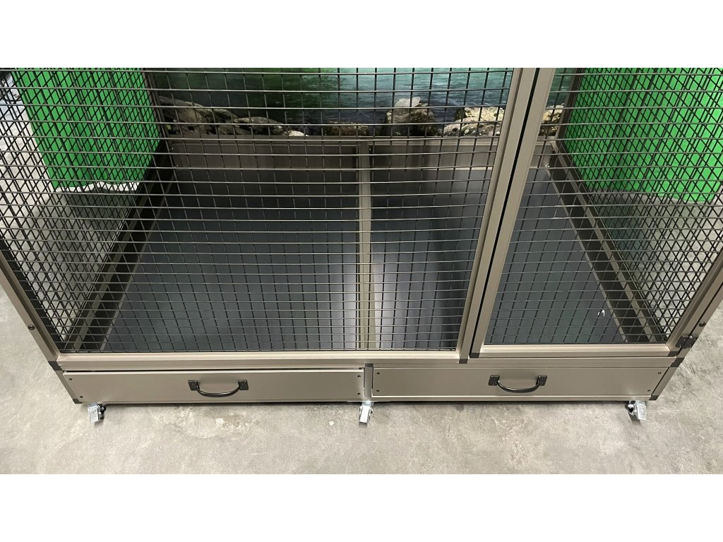 Moderní, velmi prostorná voliéra je určena pro větší druhy krotkých mazlíčků. Konstrukce je celohliníková s povrchovou úpravou INOX. Zadní i boční stěny mohou být na vyžádání plné, v barvách: stříbrná, antracit, bílá a zelená. Výplň může být také drátkovaná, tak jako je povrh profilů. Rovněž nabízíme záklopy do všech stěn. Záklopy se rozumí - uchycené plexisklo do samostatného rámečku, který se vloží do rámu klece. Tento rámeček umožňuje udržet v okolí klece maximální pořádek. Záklopy se upevňují do výšky krmného pultu. Lze nabídnout na zadní nebo boční stěnu i do celého prostoru se sítem. Cena výplní se následně dopočítá podle požadavků zákazníka.