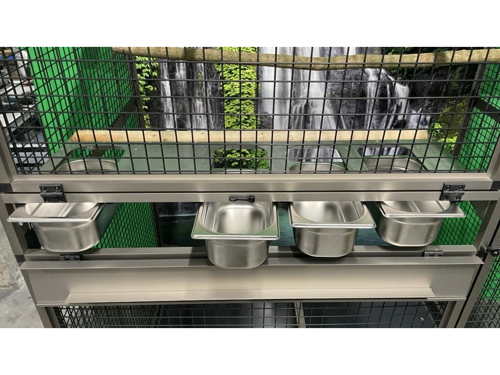 Přední stěna je vybavena nerezovým krmným pultem Ara se čtyřmi gastro nádobami (10 cm vysoké, na přání lze zaměnit i za nižší 6cm nádoby). Krmné pulty jsou navrženy tak, aby zvířeti znemožnily vytáhnout a vysypat misku s krmivem.