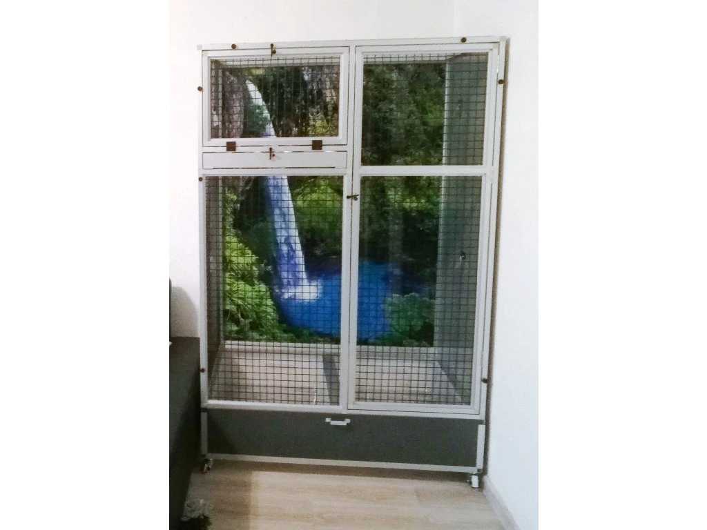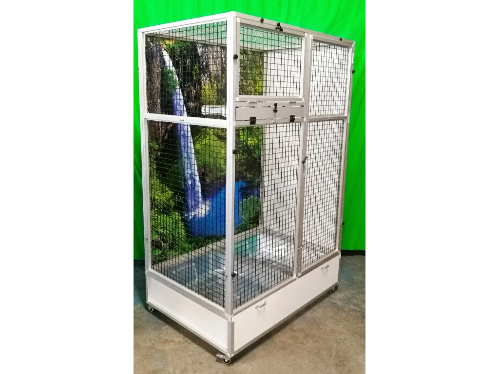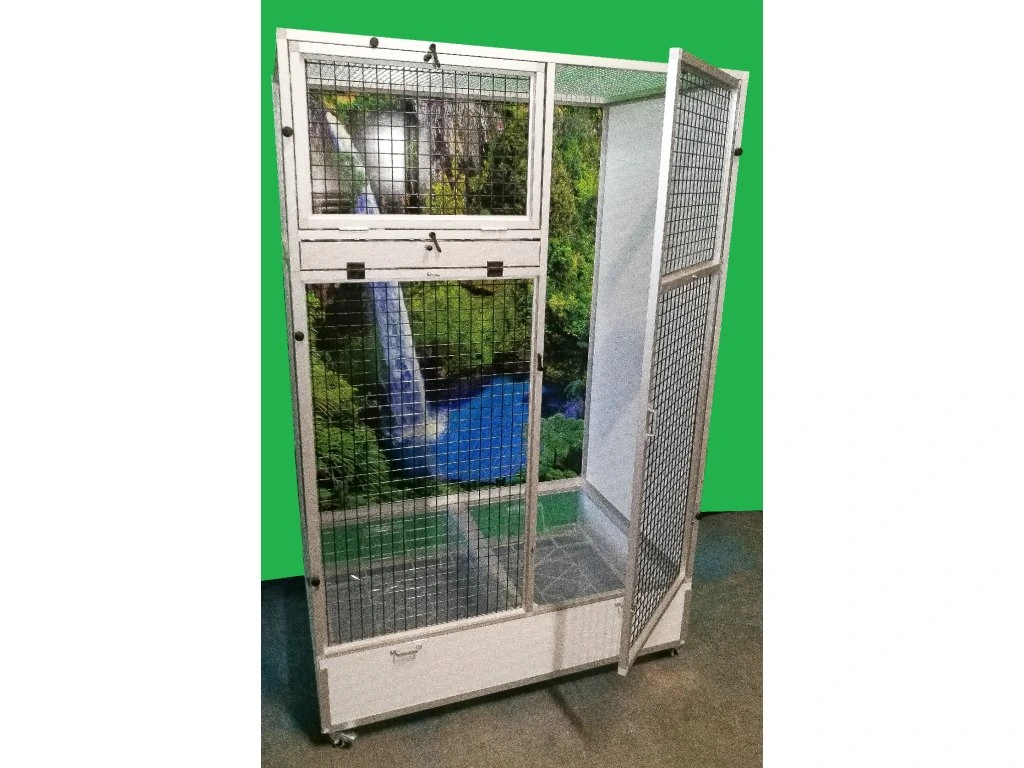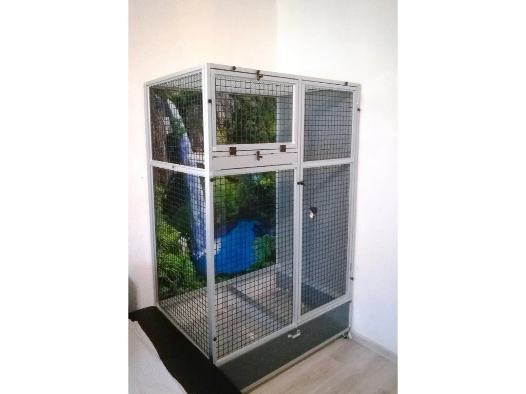 Moderní, velmi prostorná klec z dílny Aluhobby je rozebíratelná – skládací, což umožňuje postavit voliéru i tam, kde by v minulosti bylo možno umístit pouze klec.