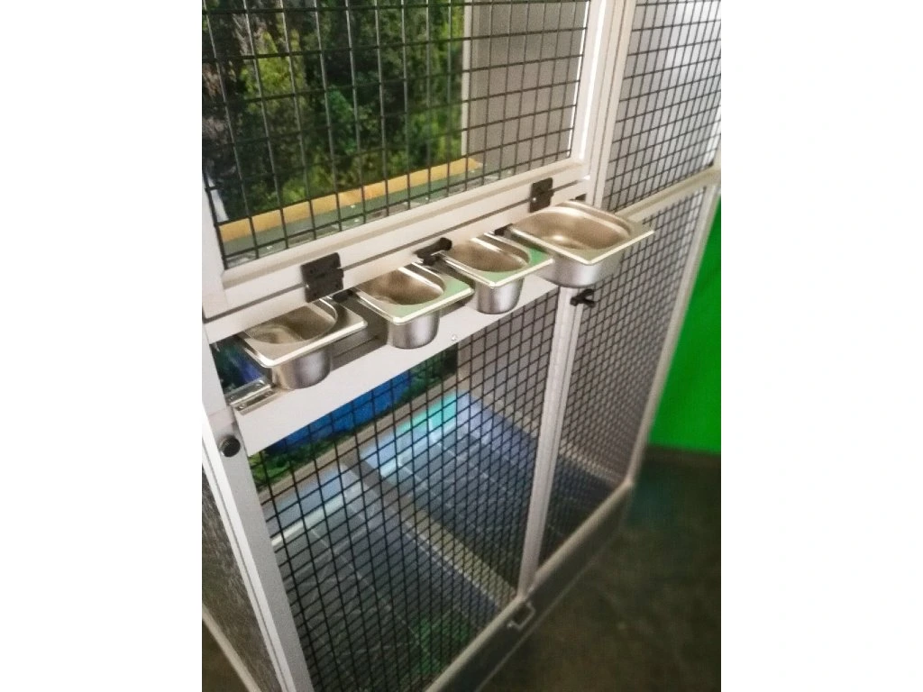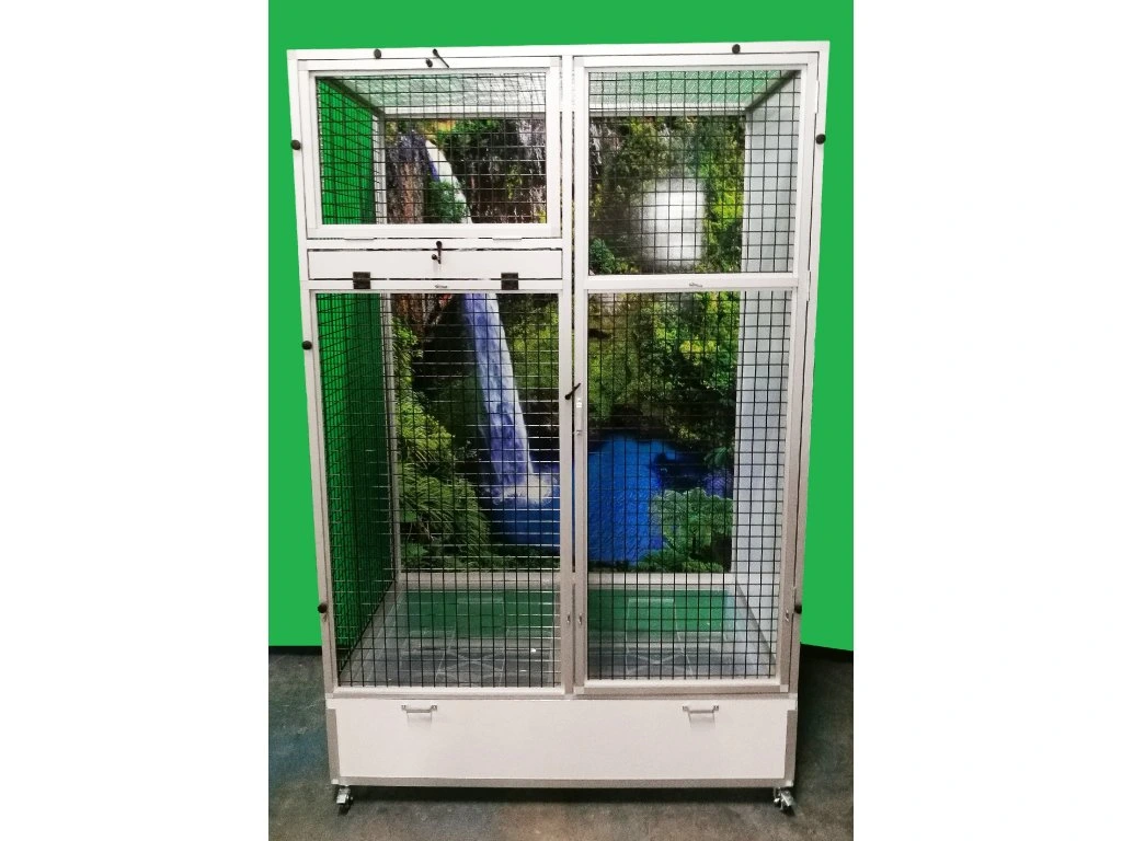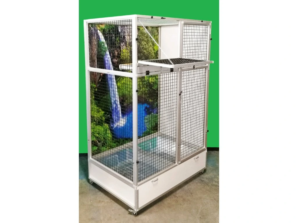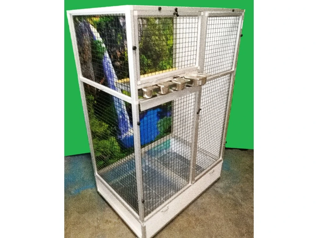 Moderní, velmi prostorná klec z dílny Aluhobby je rozebíratelná – skládací, což umožňuje postavit voliéru i tam, kde by v minulosti bylo možno umístit pouze klec.