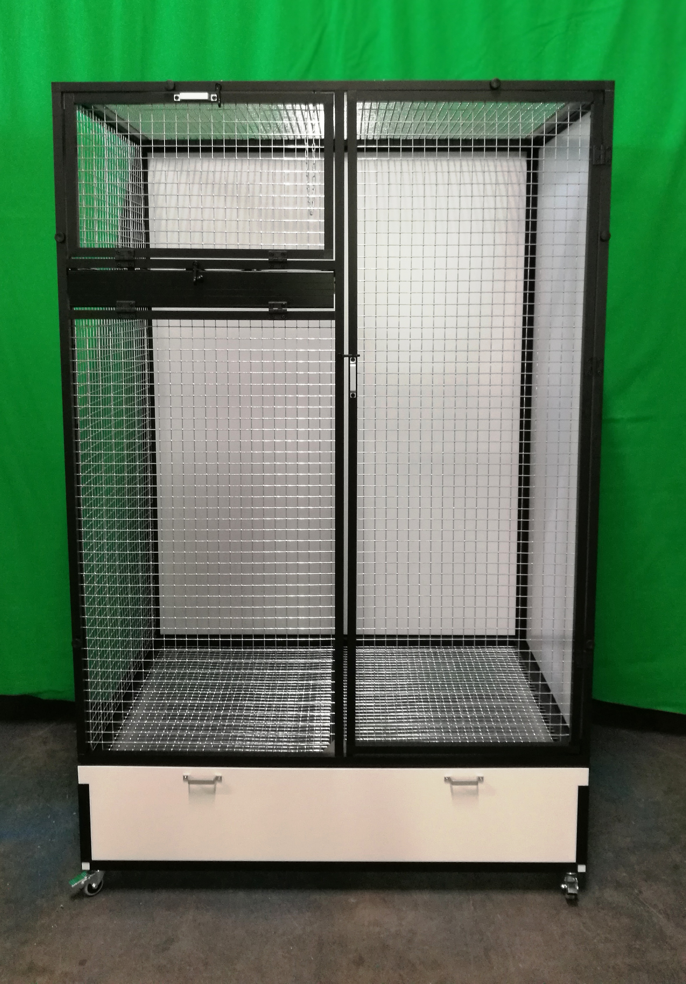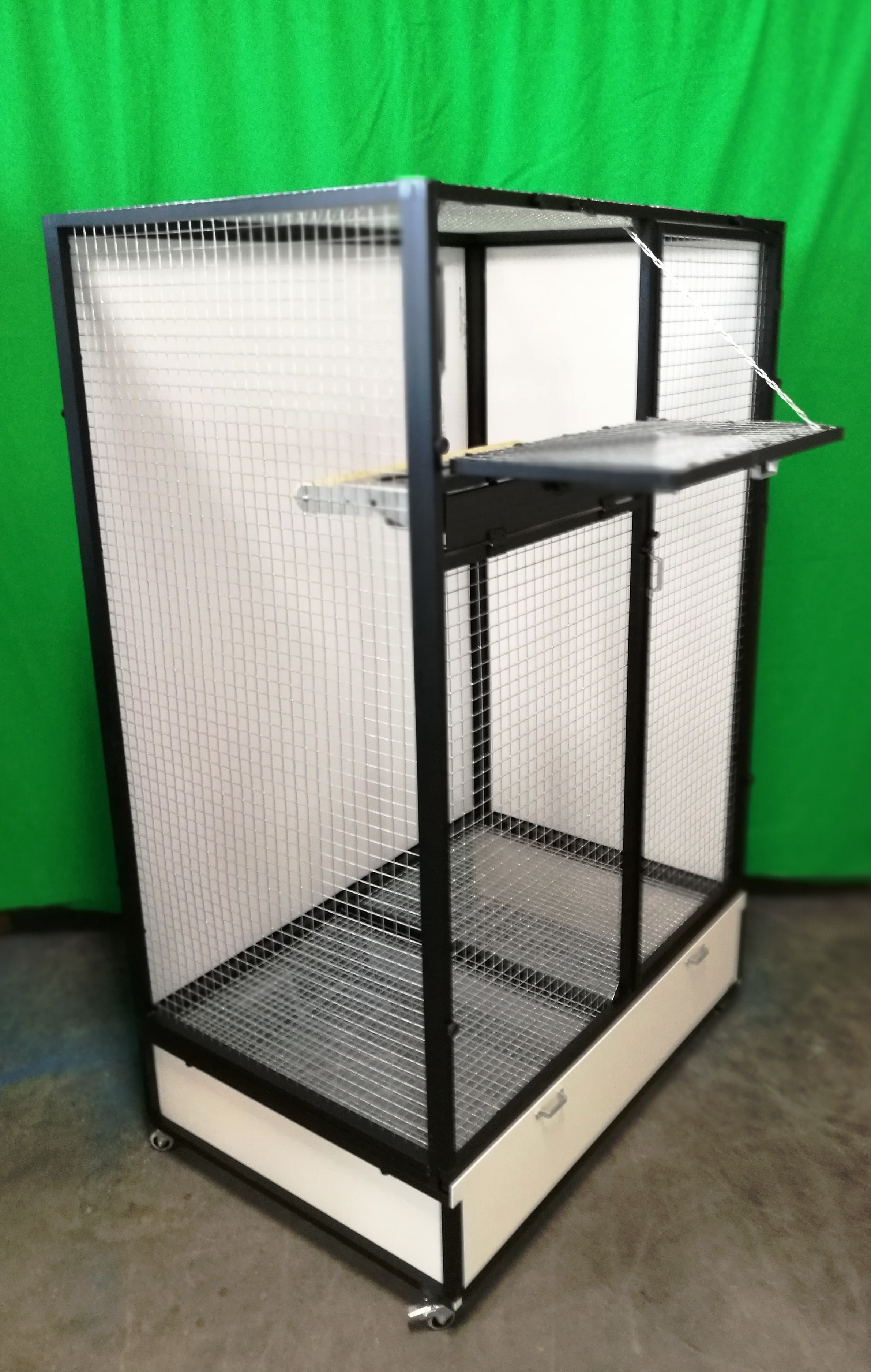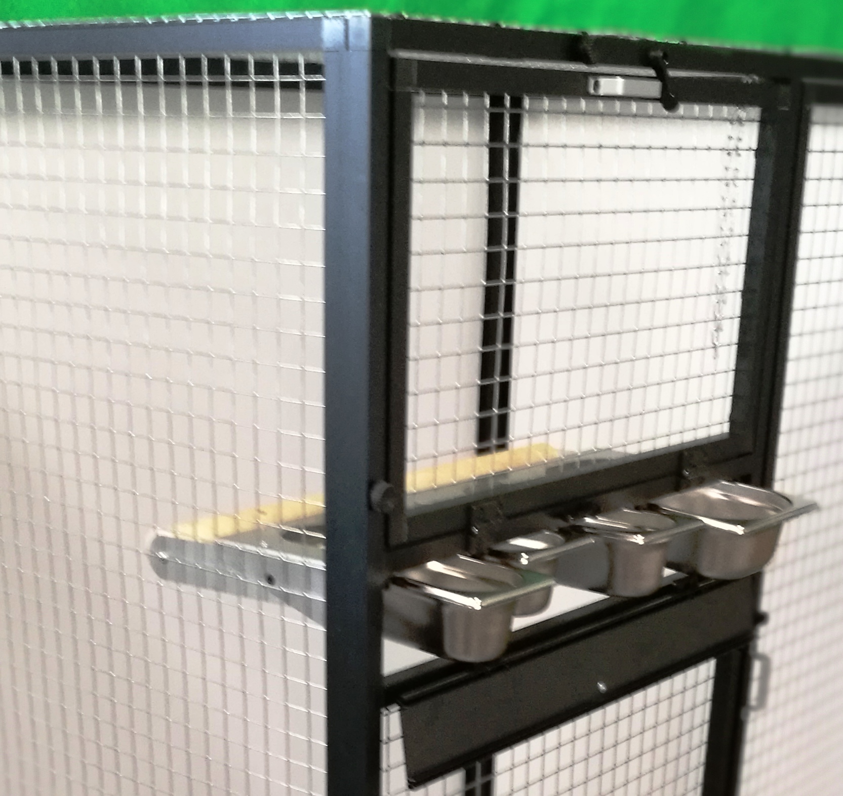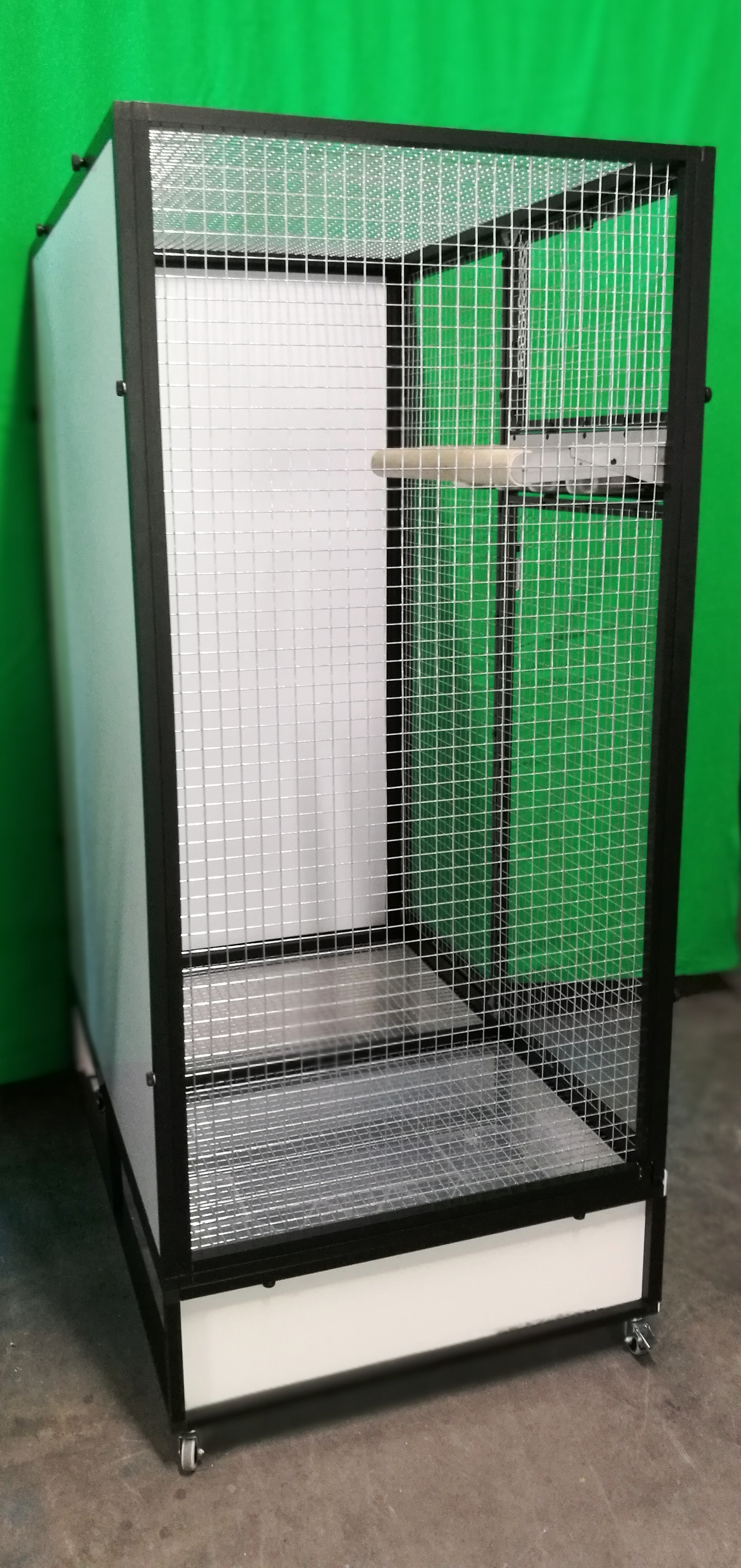 Voliéry s označením IK2 jsou velmi oblíbené, především pro svoji velikost a snadnou držbu. Provedení černý elox. není až tak běžný. U této voliéry si zákazník přál pletivo Esafort 25x25x2,05. Zadní stěna a jedna boční stěna je vyplněna hliníkovým sendvičem v bílé barvě. Nám by se na zadní stěnu líbila i některá z tapet. Ale rozkaz zněl jasně, čistě bílá.