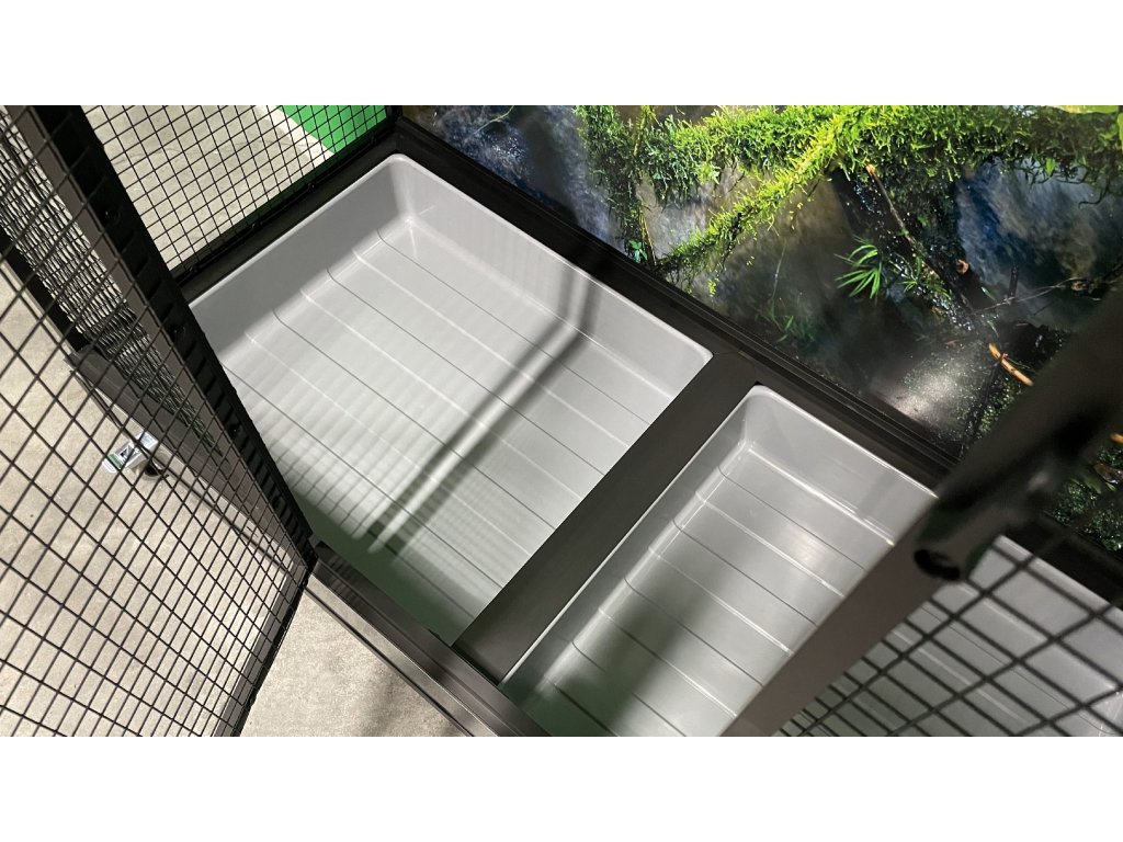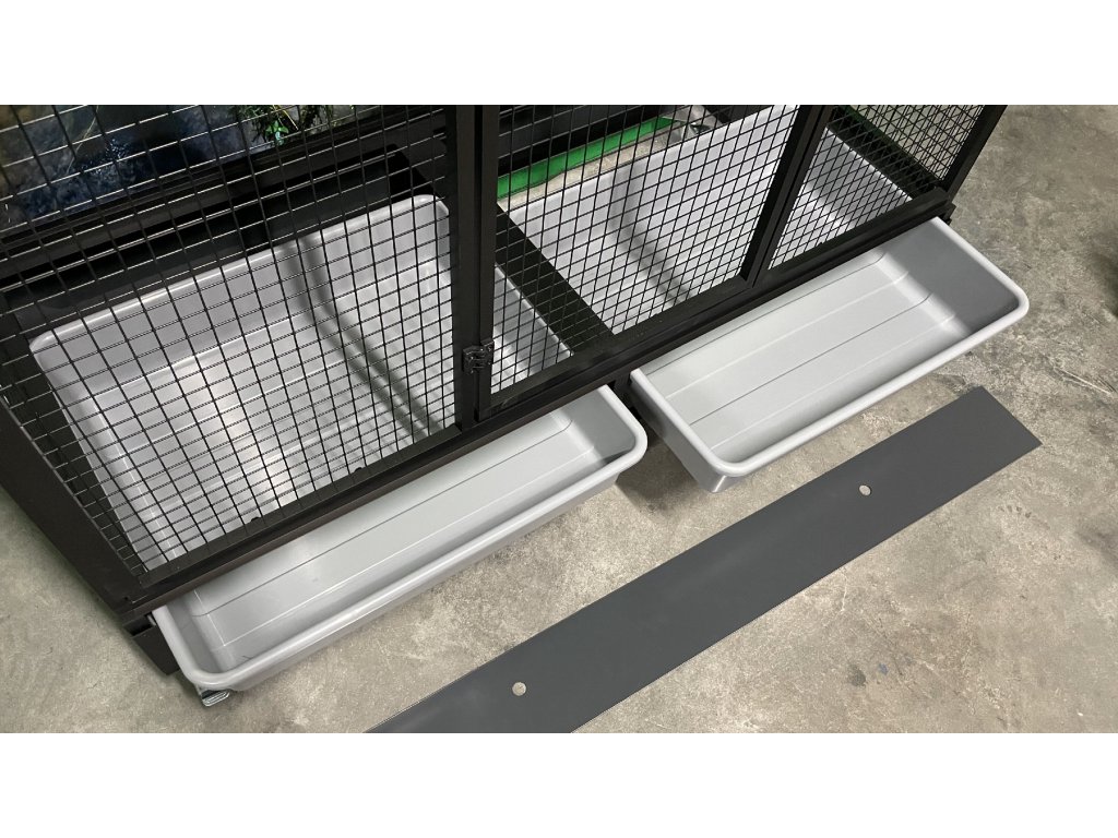 Klec je postavena na samostatném podvozku, který je vybaven dvěma plastovými vaničkami. Manipulace s vaničkami při čištění klece je velmi snadná. Vanička je 18 cm hluboká, což umožňuje udržet pořádek v okolí voliéry. Přední stěna je vybavena pěti zásuvnými průhlednými krmítky. Konstrukce klece je vyrobena z hliníkových profilů s povrchovou úpravou eloxováním do černé matné barvy. Použito je velmi kvalitní pletivo značky Esafort oko 19x19, drát 1,5 mm. Pletivo je nabarveno do černé matné barvy, což umožňuje lepší pohled na chované zvíře.