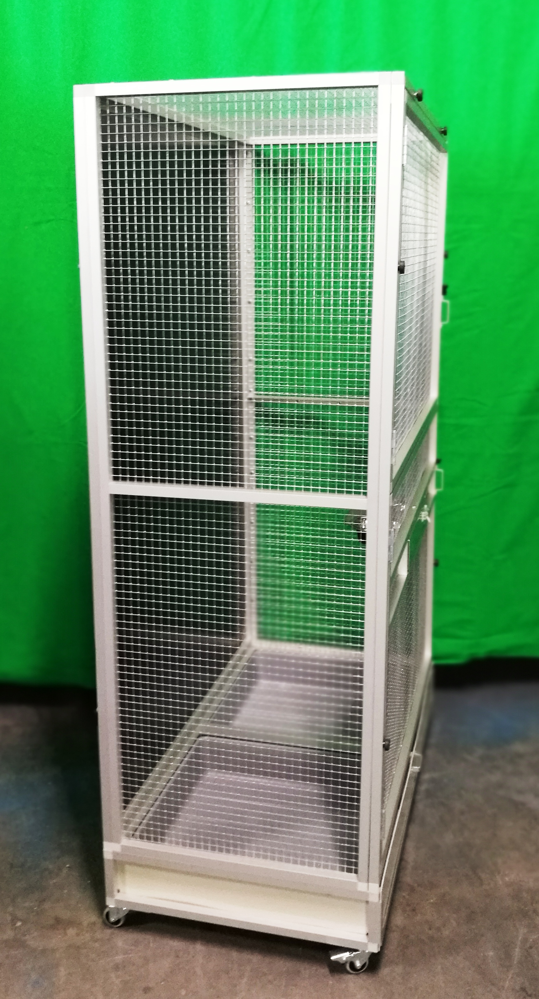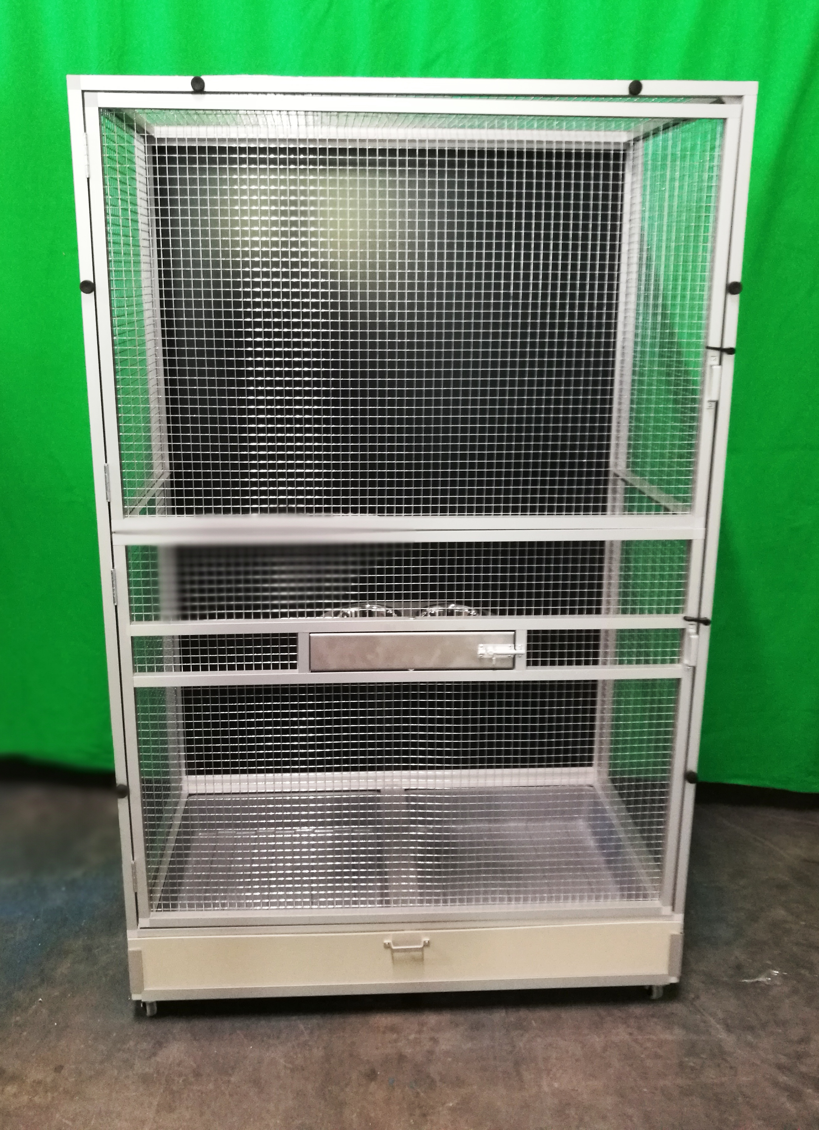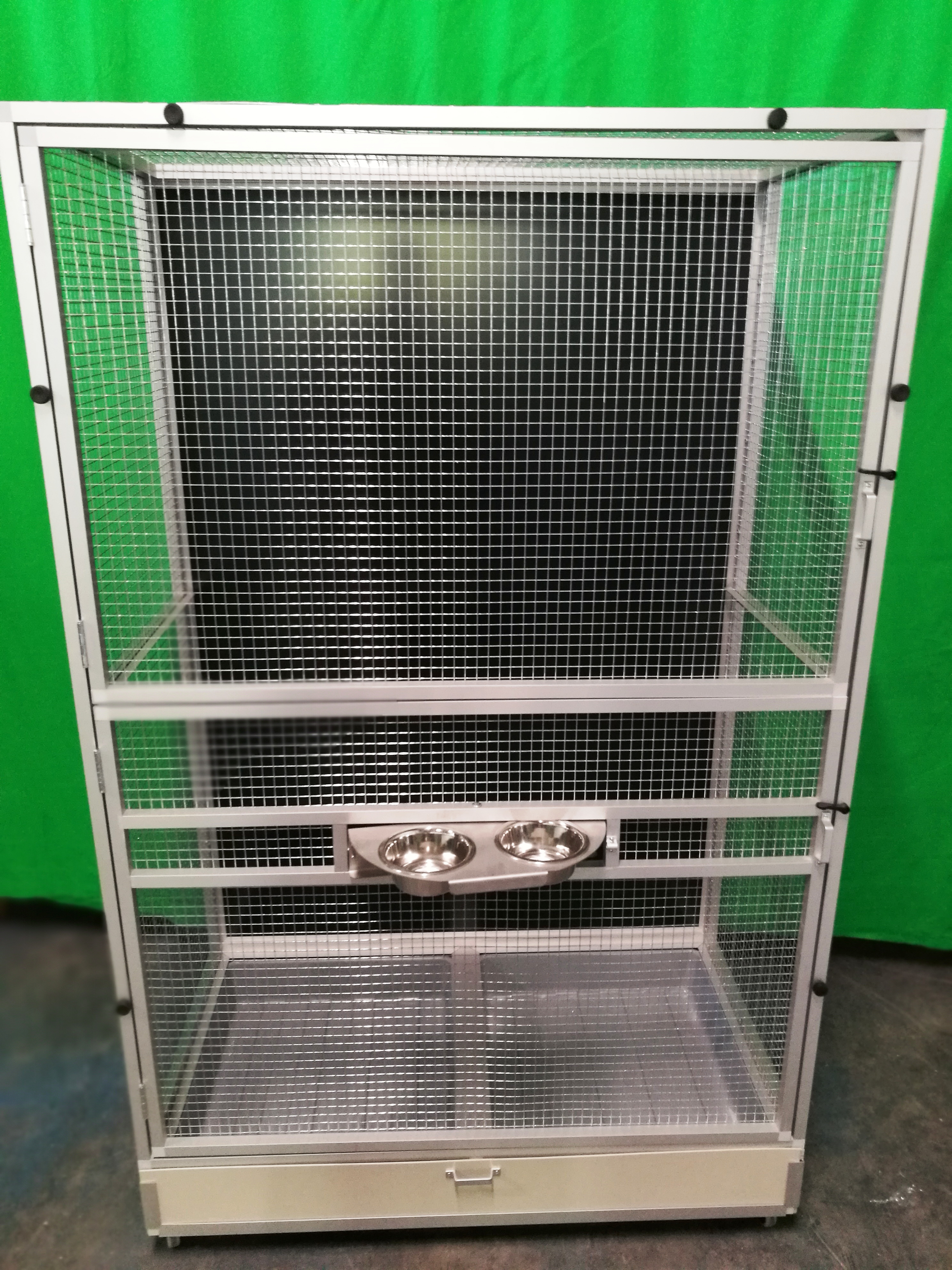 Voliéra je postavena na podvozku Pol2 . Přední stěnu si chovatelka navrhla sama. Celá přední stěna jde otevřít. Podmínkou byla možnost rozdělení voliéry v době, kdy mají mladé na polovinu. Chovatelce šlo o to, aby samice měla klid pro svá mláďata a nemusela samici stěhovat do jiné klece. Voliéra je na kolečkách. V podvozku voliéry jsou umístěny dvě vaničky. Rozměry voliéry 108x60 výška 174. Pletivo oko 12,7x12,7 mm drát 1,02mm.