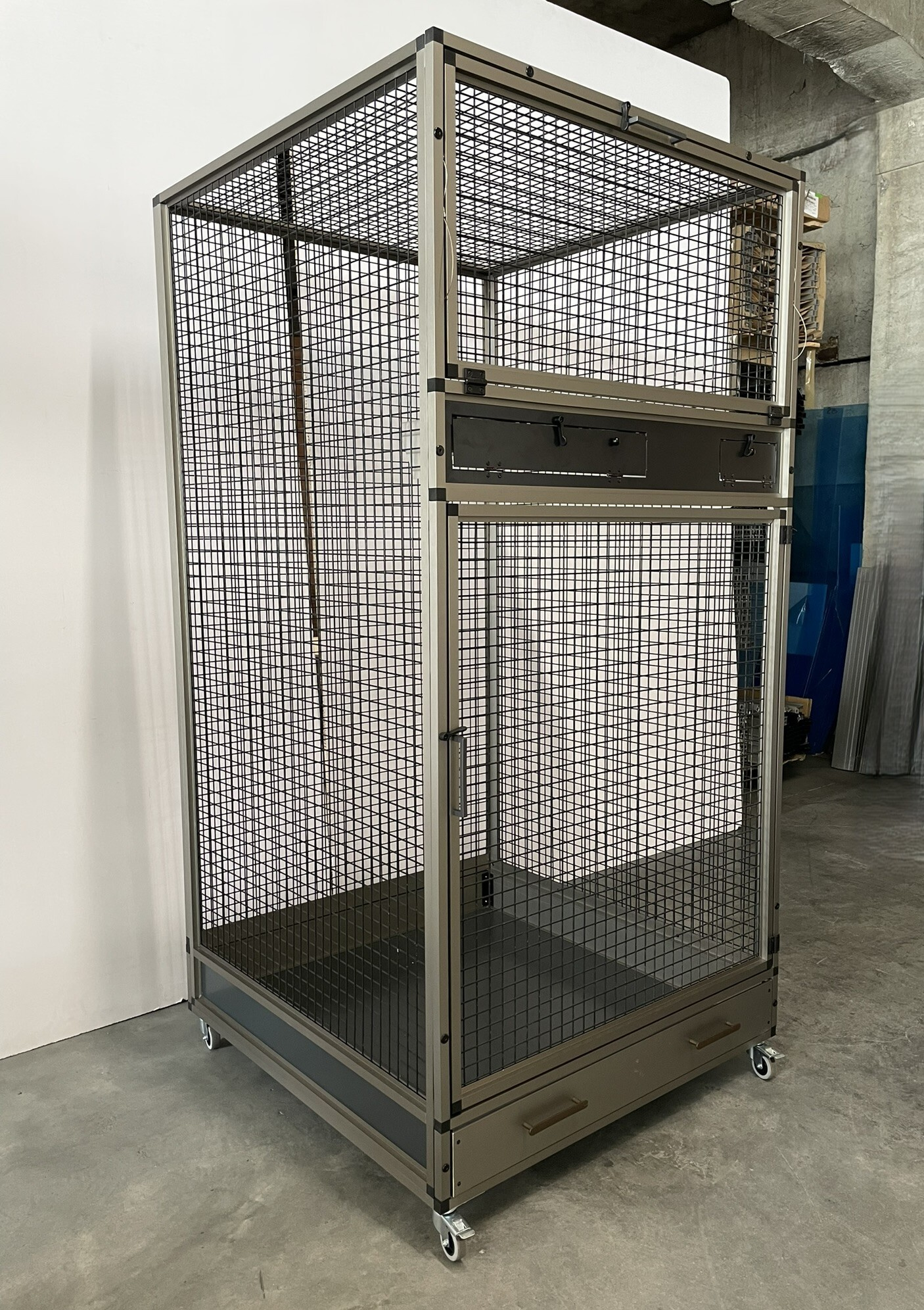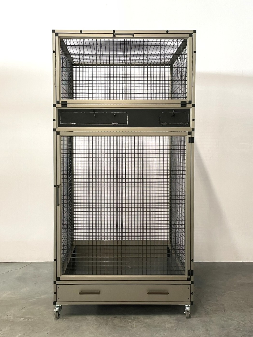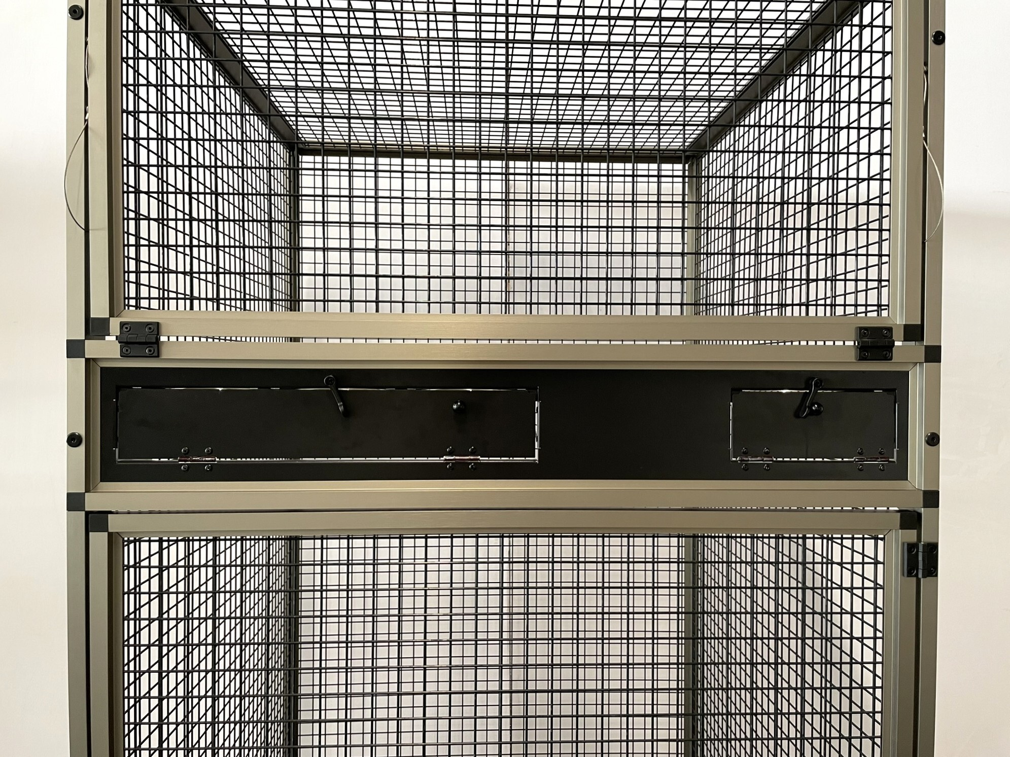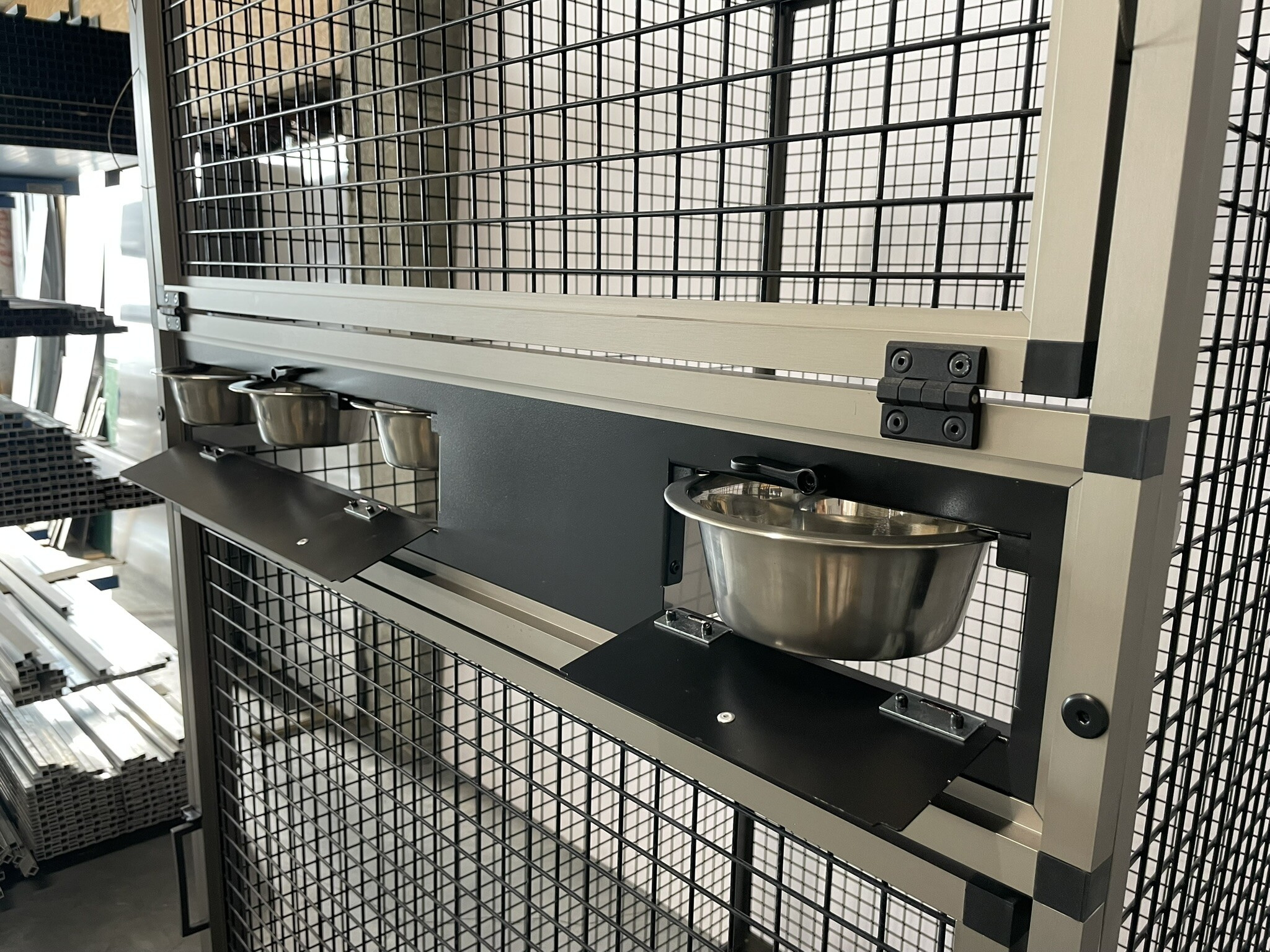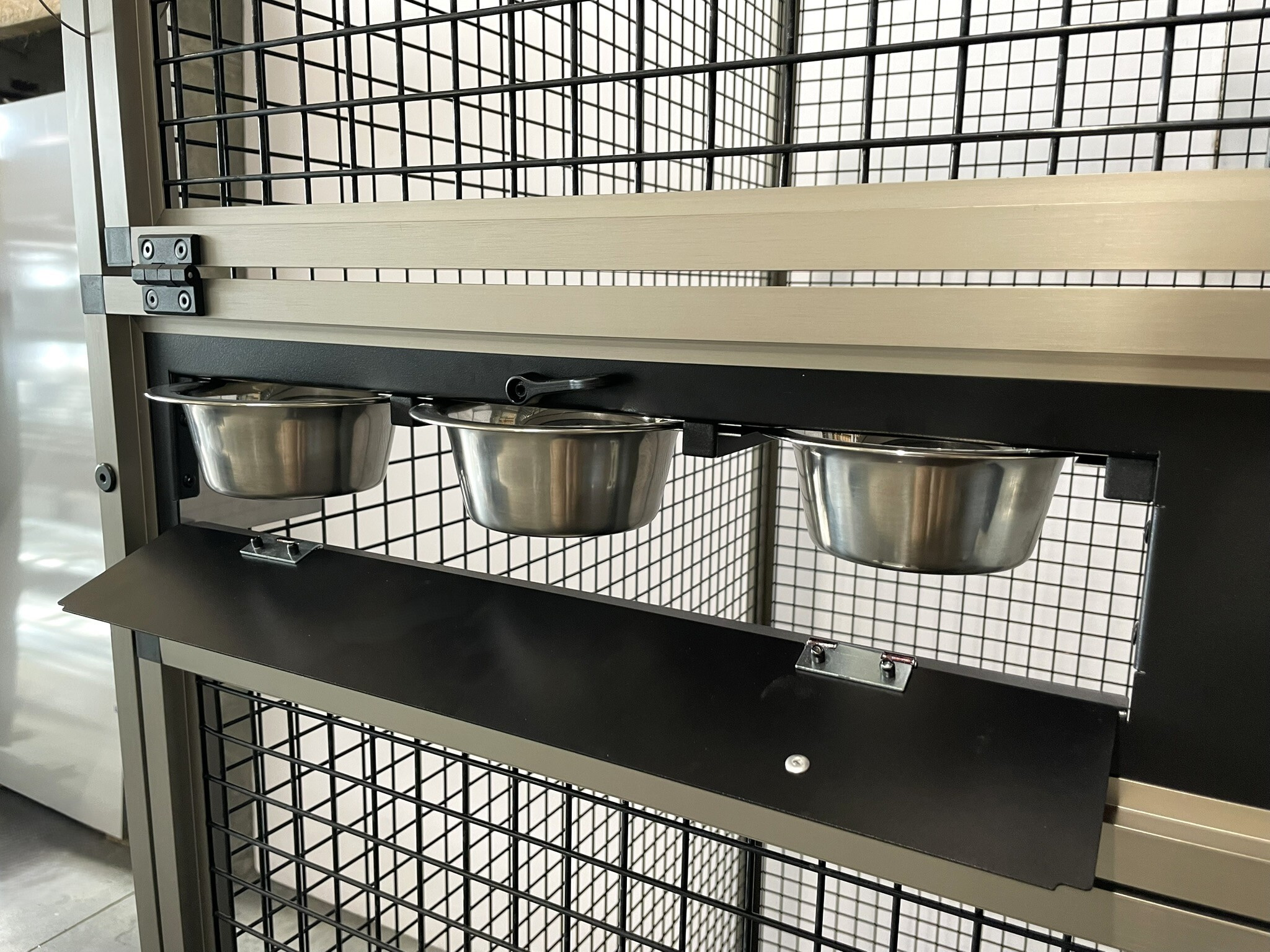 Přední stěna je vybavena nerezovým krmným pultem Ara se čtyřmi gastro nádobami (10 cm vysokými, na přání je lze nahradit nižšími 6cm nádobami). Krmné pulty jsou navrženy tak, aby zvíře nemohlo misku s krmivem vytáhnout a vyprázdnit.