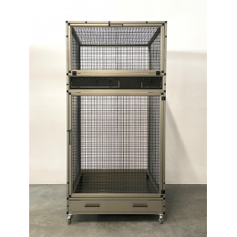 Moderní, velmi prostorná voliéra je určena pro větší druhy ptactva. Konstrukce je celohliníková s povrchovou úpravou INOX. Zadní a boční stěny mohou být na přání plné a jsou k dispozici v těchto barvách: stříbrná, antracitová, bílá a zelená. Výplň může být také drátkovaná, stejně jako povrch profilů. Za příplatek 1000 Kč/m2 nabízíme tapetu s motivem pralesa. Nabízíme také záklopy do všech stěn. Záklopy se rozumí uchycené plexisklo do samostatného rámečku, který se vloží do rámu klece. Tento rámeček umožňuje udržet v okolí klece pořádek. Záklopy se upevňují do výšky krmného pultu. Nabízíme je také na zadní nebo boční stěnu i do celého prostoru se sítem. Cena výplní se pak vypočítává podle požadavků zákazníka.