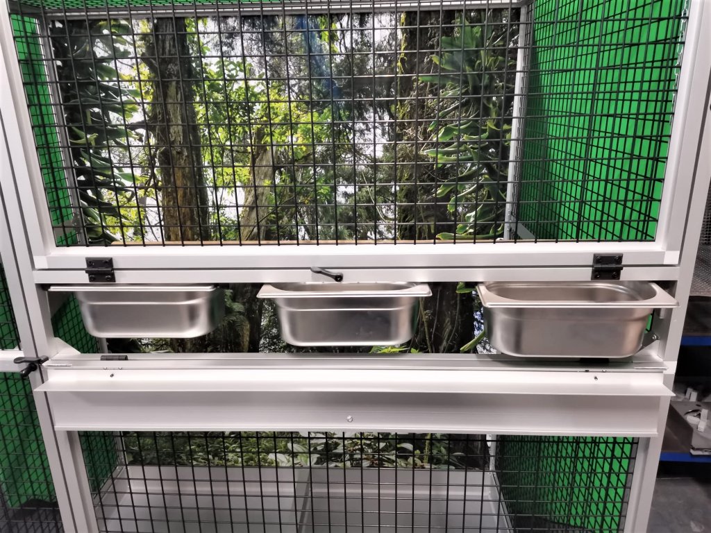 Výletové okno je součástí této voliéry a je umístěno nad krmnými pulty.