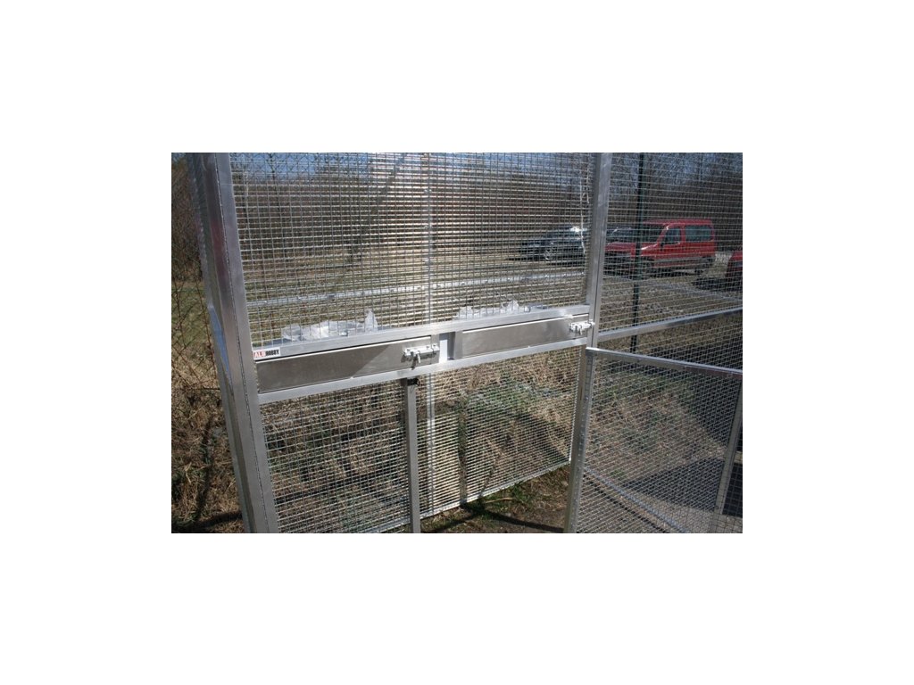 Voliéra potažena pletivem Esafort 19x19x1,45 mm. Na přání zákazníka lze pletivo zaměnit za jiné z naší nabídky. Pletivo v celé voliéře je natáhnuto z nitra voliéry, a to z estetických důvodů. Celá voliéra je šroubována šrouby M6. Do rámu jsou nanýtovány nerezové závity. Voliéra je vybavena dvěma nezávislými otočnými krmnými pulty. Jeden krmný pult určený pro vodu osazen miskou o obsahu 0,75 l. Druhý krmný pult je osazen dvěma miskami o obsahu 0,35 l.