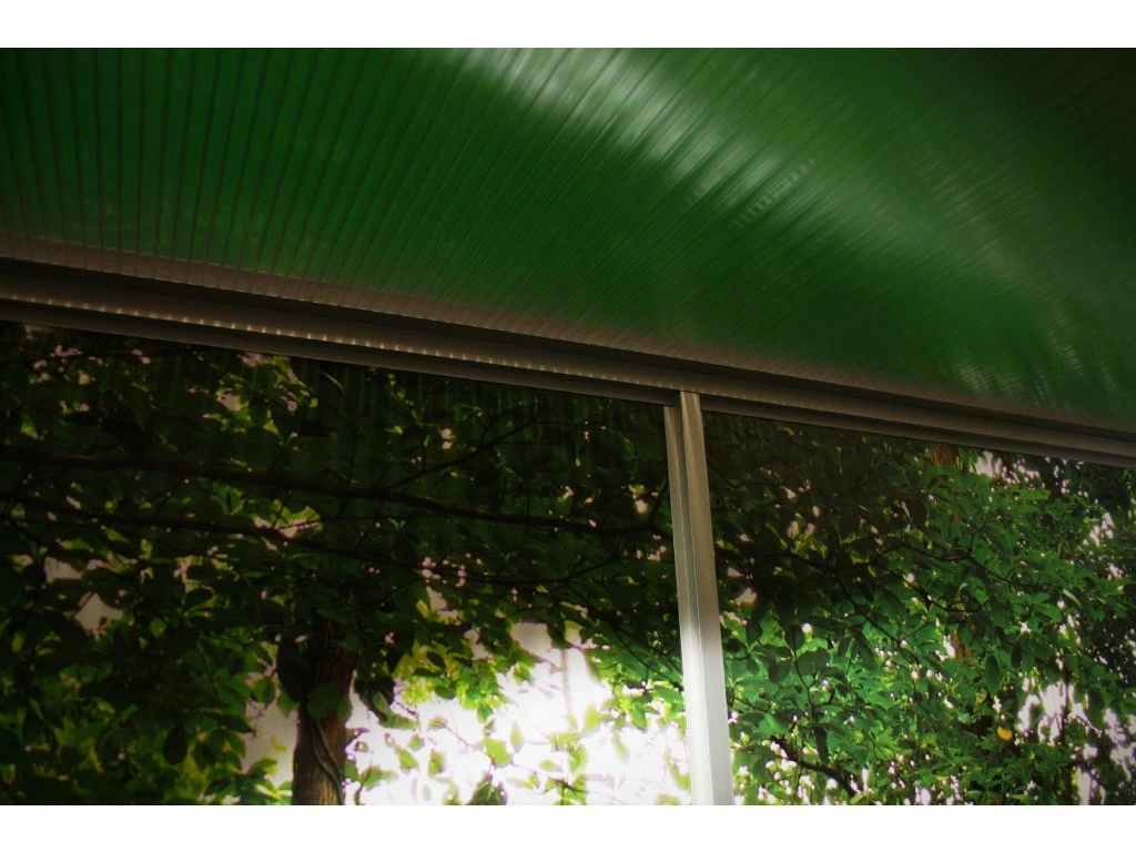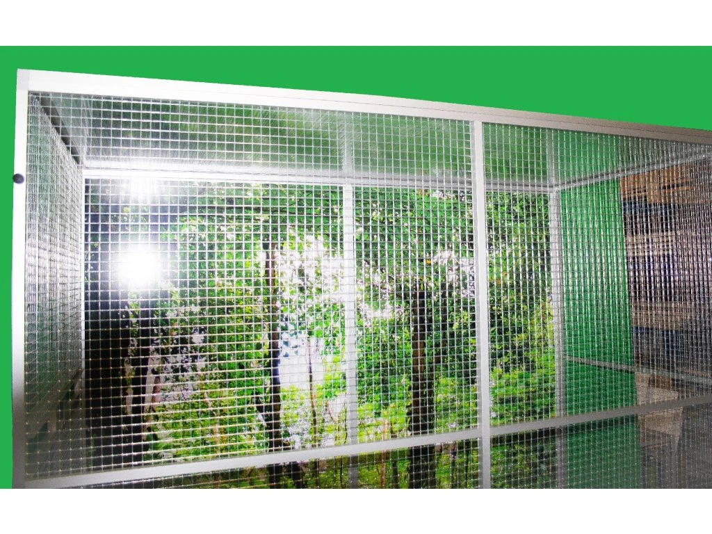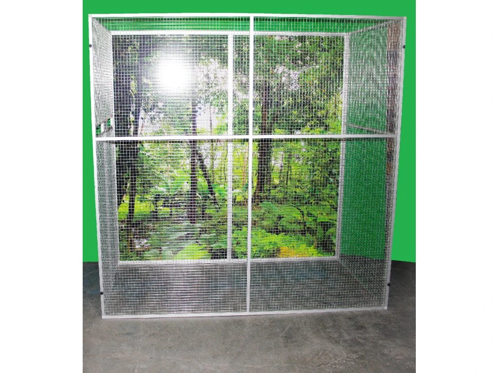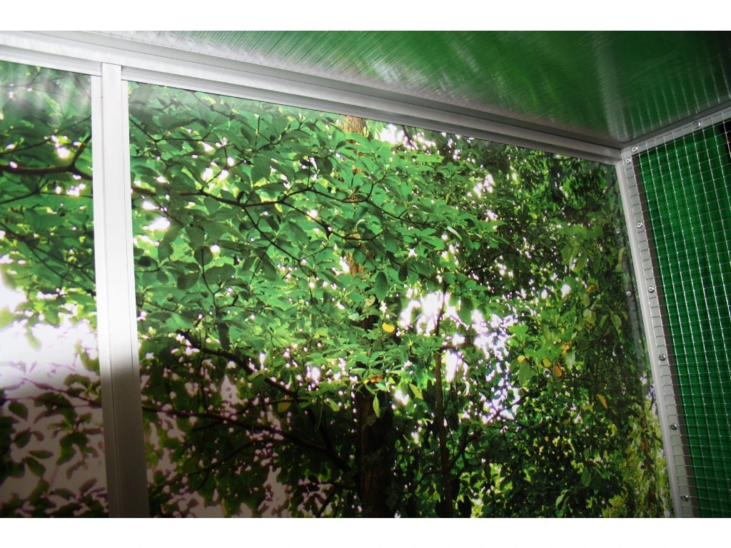 Voliéra je složena z pěti samostatných rámů. Tuto voliéru nabízíme pouze s povrchovou úpravou stříbrný elox. (za příplatek 1200 Kč můžeme vyrobit v černém eloxovaném provedení). Zadní stěna této voliéry je z materiálu, kterému říkáme hliníkový sendvič a je vždy potažena fototapetou s motivem pralesa. Tapeta je ze zdravotně nezávadného materiálu s použitím laminace, ochranou proti oděru. Výplně jsou zasunuty do profilu s označením HJ20V. Tím je zvířeti zamezeno dostat se na okraj desky, je takto chráněna i tapeta. Tapeta je v ceně voliéry.