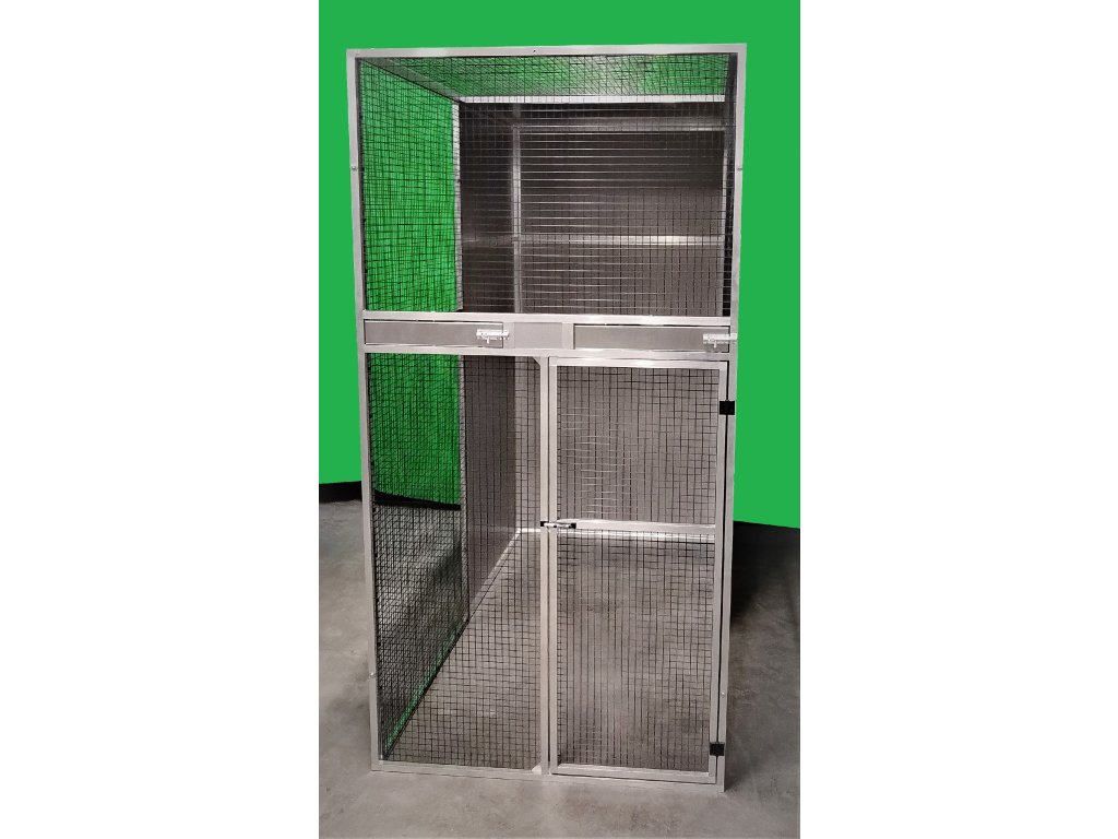 V rámu nad dvířky jsou vloženy dva hliníkové otočné krmné pulty. Jeden krmný pult se dvěma nerezovými miskami o obsahu 0,35 l (KPM02), druhý krmný pult určený na vodu, je s jednou miskou o obsahu 0,75 l (KPV01). Voliéra je potažena pletivem Esafort 19x19x1,45 mm. Toto pletivo je ochráněno práškovou zdravotně nezávadnou barvou do odstínu černý mat. Barva je vypálena a je odolná proti okusu zvířaty.