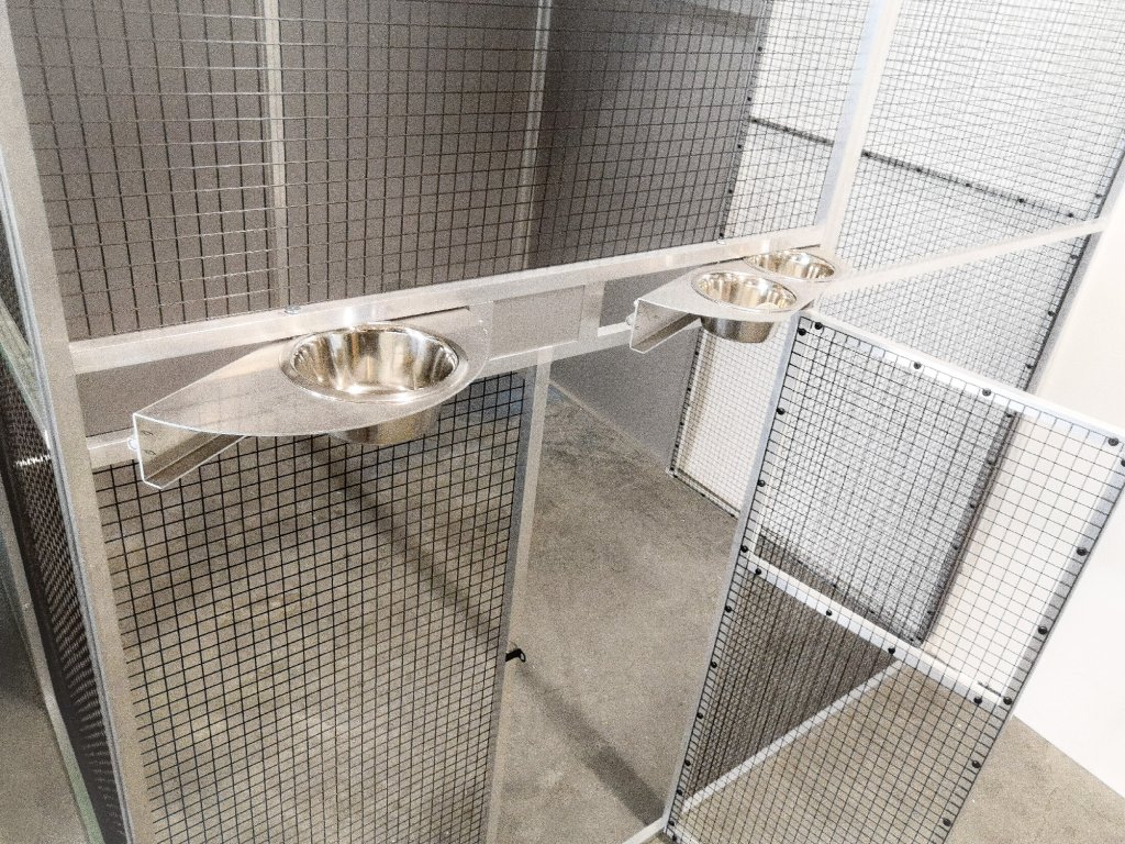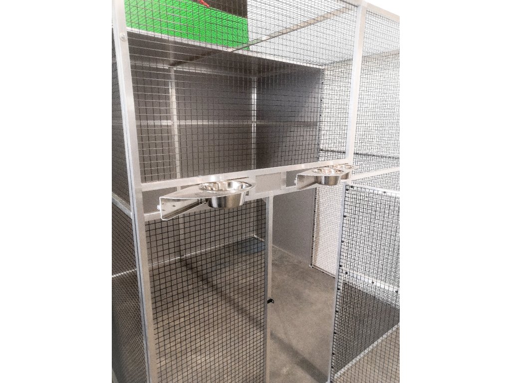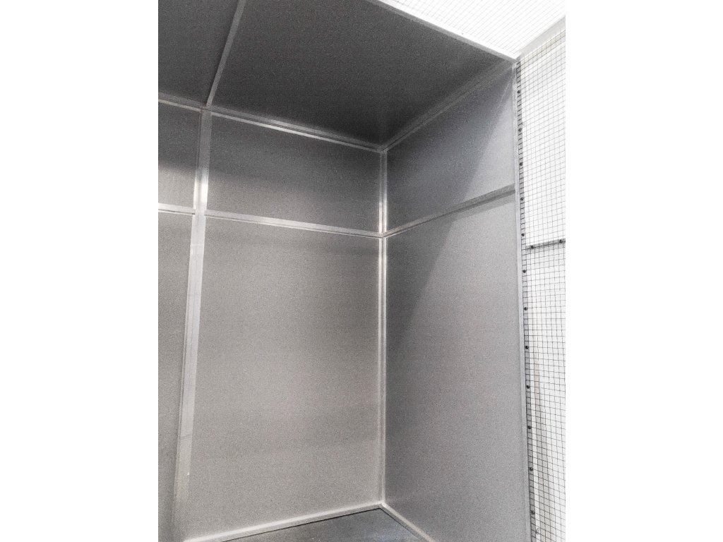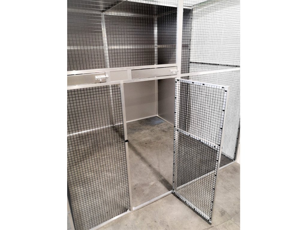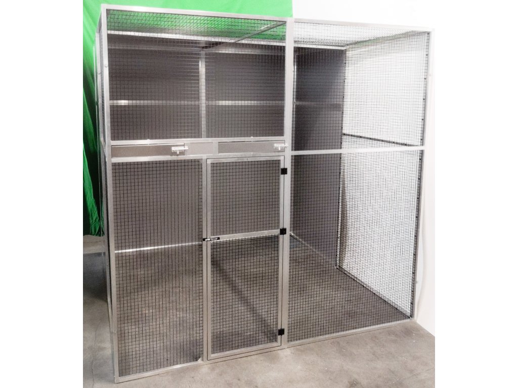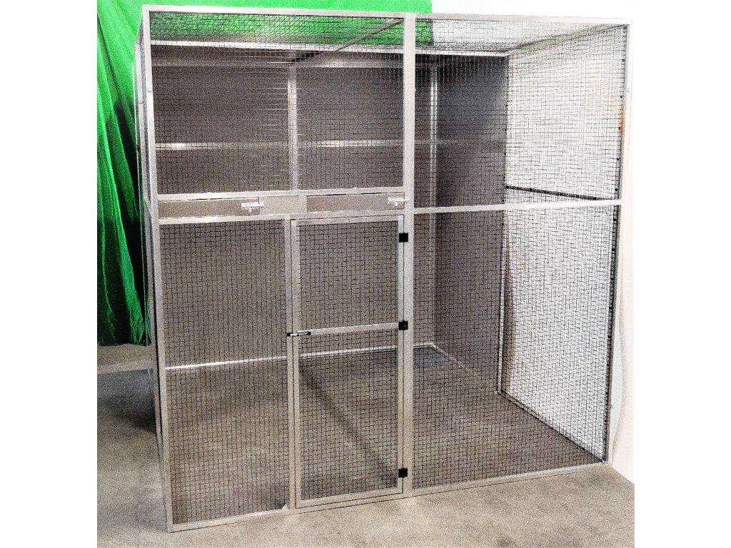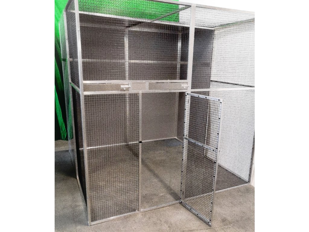 Voliéra o rozměrech: hloubka 206 cm, výška 200 cm, šířka 200 cm je složena z deseti rámů. Dvířka do voliéry mají výšku 120 cm, šířku 55 cm. Zadní stěna a boční stěny, vytvářejí takzvaný zálet. Na výplně stěn je použitý hliníkový sendvič vložený do profilu. Rovněž strop je nad záletem plný. I tady je použitý hliníkový sendvič, který je upevněn z jedné poloviny na rámu. Druhá polovina stropu je potažena černým pletivem. Na přání zákazníka může být barva výplní bílá, antracitová, zelená, žlutá případně stříbrná tak jako je vidět na obrázku. V rámu nad dvířky jsou vloženy dva hliníkové otočné krmné pulty. Jeden krmný pult se dvěma nerezovými miskami o obsahu 0,35l (KPM02). Druhý krmný pult určený na vodu, je s jednou miskou o obsahu 0,75l (KPV01). Voliéra je potažena pletivem Esafort 19x19x1,45mm v odstínu černý mat. Pletivo v celé voliéře je natáhnuto z nitra voliéry a to z estetických důvodů. Celá voliéra je prošroubena šrouby č.6. do rámu jsou nanýtovány nerezové závity. Voliéru posíláme paletovou dopravou Toptrans. Voliéra je velice rychlá a jednoduchá na složení a opětovné rozložení.