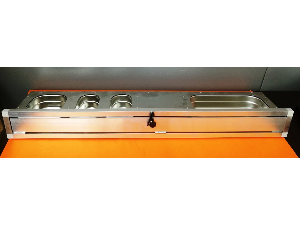 Krmný pult je dodáván ve složeném stavu včetně rámečku. Rámeček je tvořen z hliníkového profilu 20x20x1,5 mm. Pokud se zákazník rozhodne zabudovat krmný pult přímo do konstrukce voliéry je ideální nechat si zaslat krmný pult a rámeček samostatně. V rámečku pak lze jednoduše zaměnit spojky a zabudovat pult přímo do konstrukce.